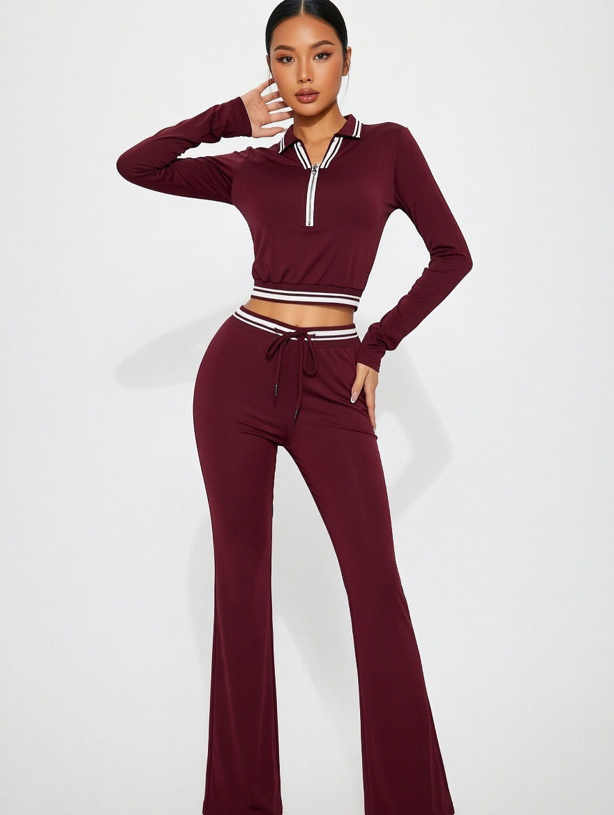 The cropped long-sleeve zip-up top features a collared neckline, sleek zipper front, and contrast striped trim for a sporty-chic vibe that flatters your figure. Paired with high-waisted flare pants that offer a relaxed yet fitted silhouette, complete with an adjustable drawstring waist and matching striped cuffs for effortless coordination.