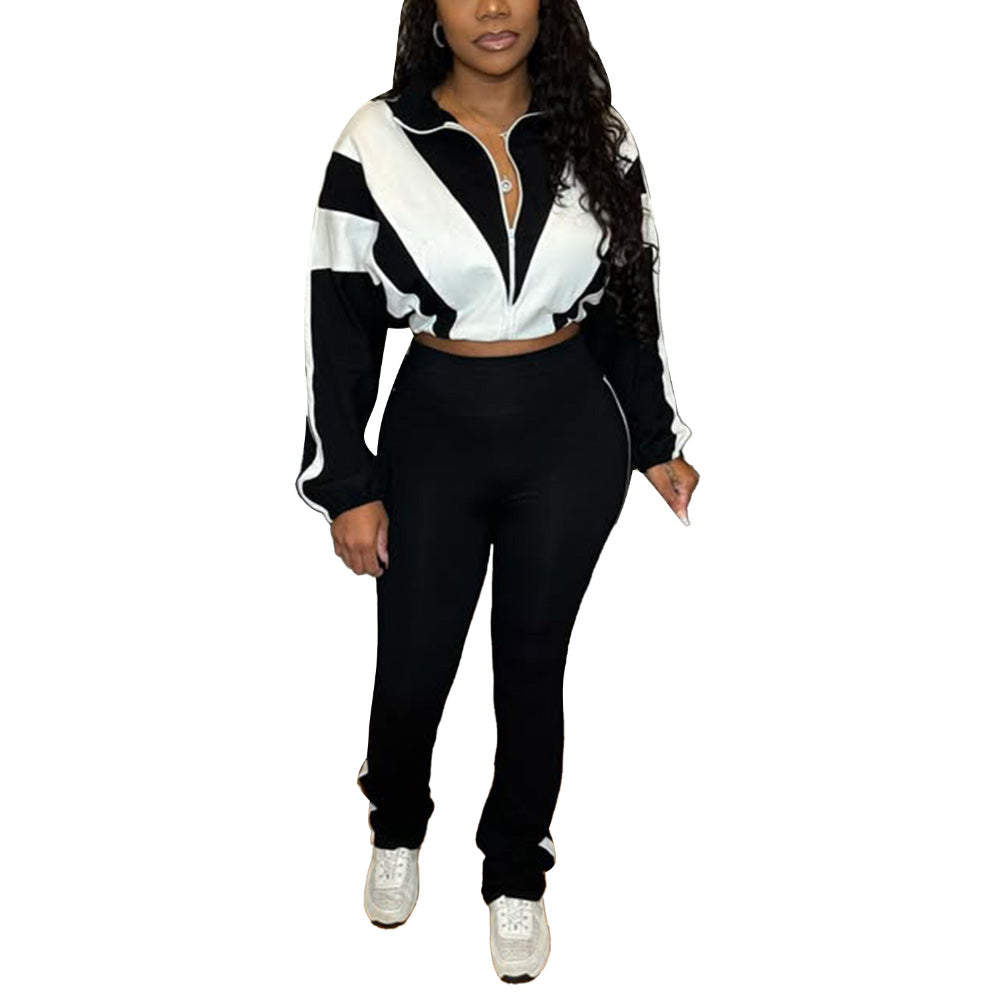 This stylish two-piece set features a cropped zip-up jacket with a bold panel design and a flattering high-waist jogger pant. The jacket includes a stand collar and elastic cuffs for a sporty vibe, while the matching fitted pants offer a sleek silhouette with subtle stripe accents on the sides. Perfect for casual days, athleisure wear, or running errands in style.