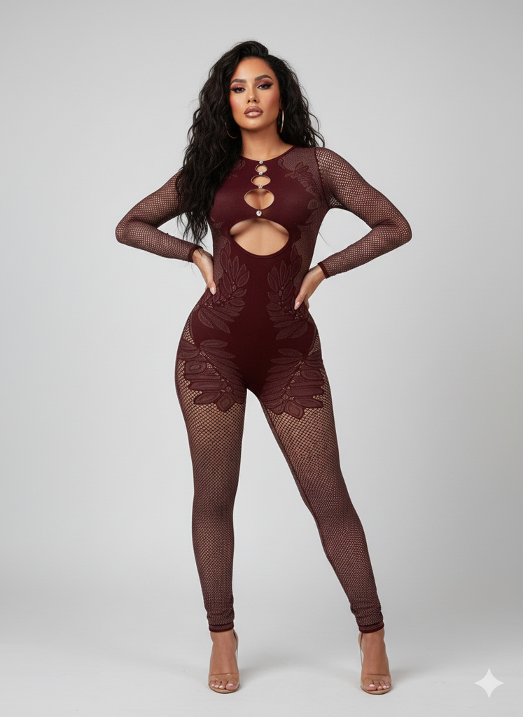 This sleek jumpsuit has a fitted, full-length design and sheer mesh material all over, complete with long sleeves that exude sultry style. Vertical cutouts along the chest and sleeves are connected by small circular rings, giving it a daring and cutting-edge look. The intricate lace patterns on the body add a touch of refined beauty and captivating detail. With its form-flattering silhouette, this jumpsuit is a must-have for any glamorous evening or fashion-forward occasion.
