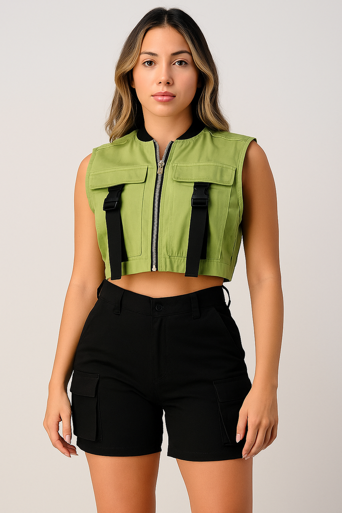 MB FASHION Cropped Tactical Vest with Zipper and Buckle Straps 8156T