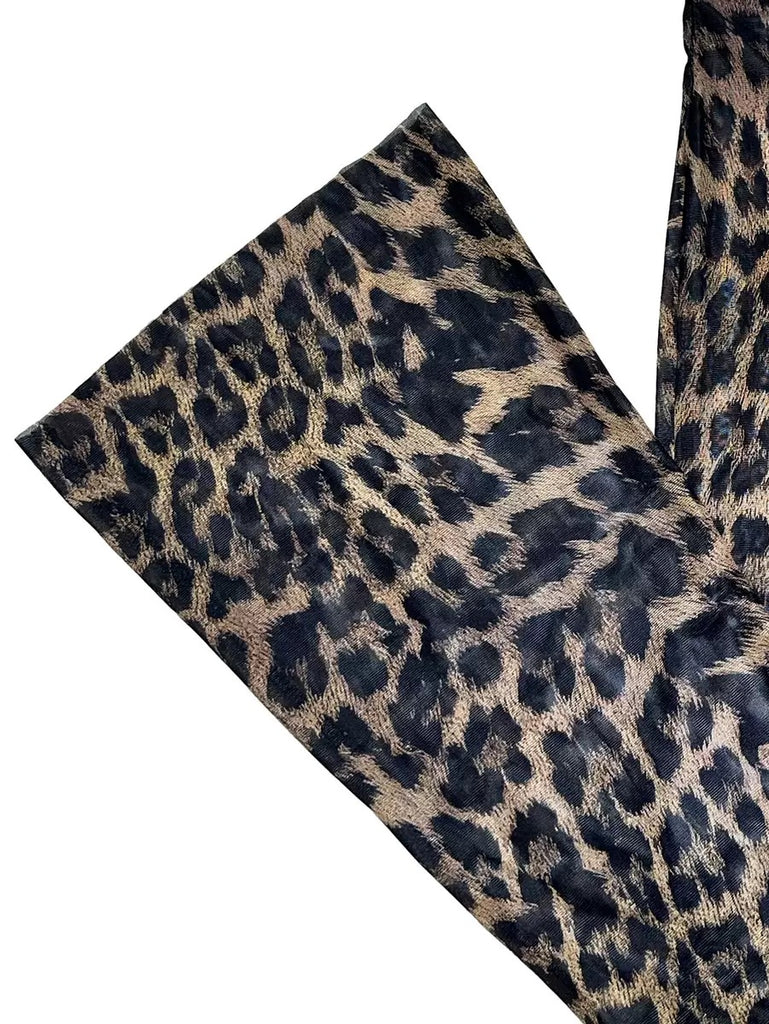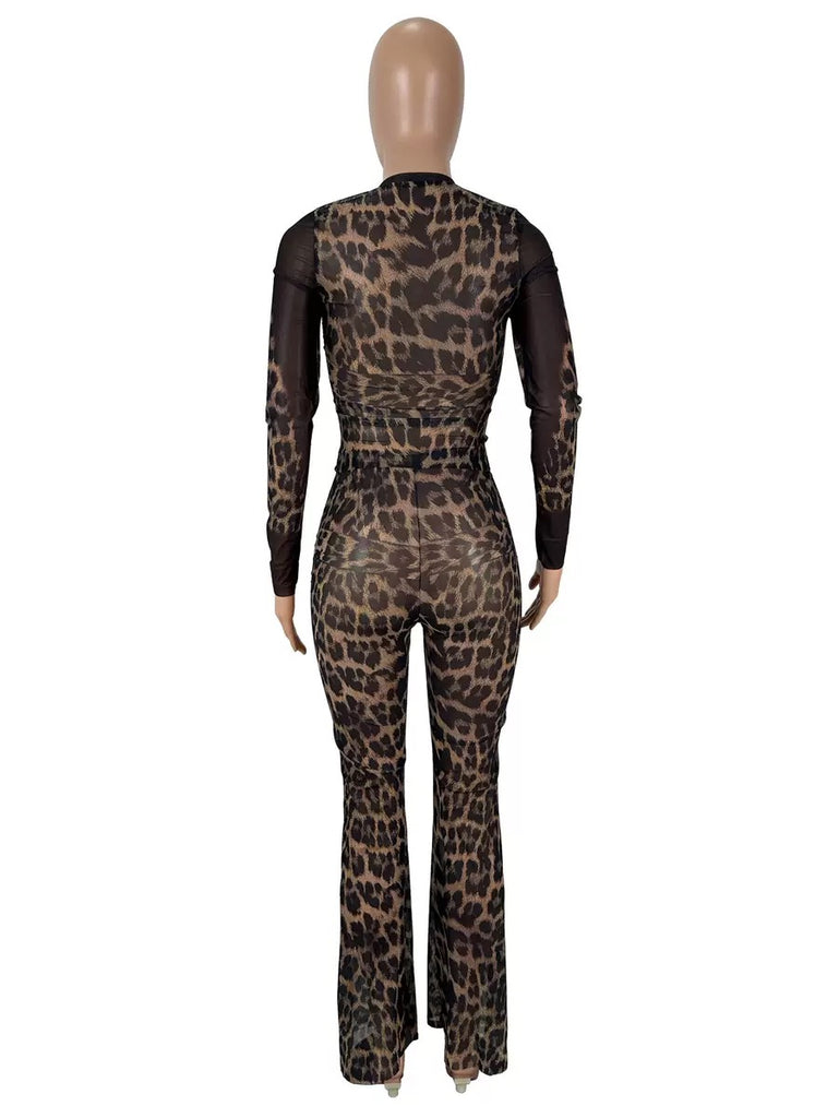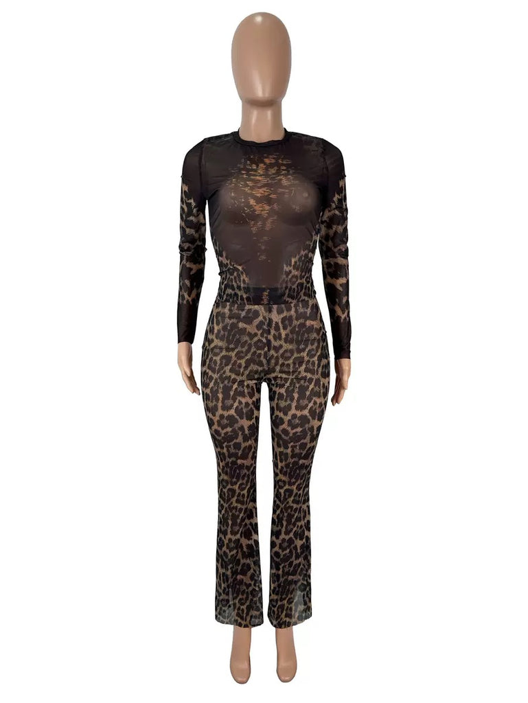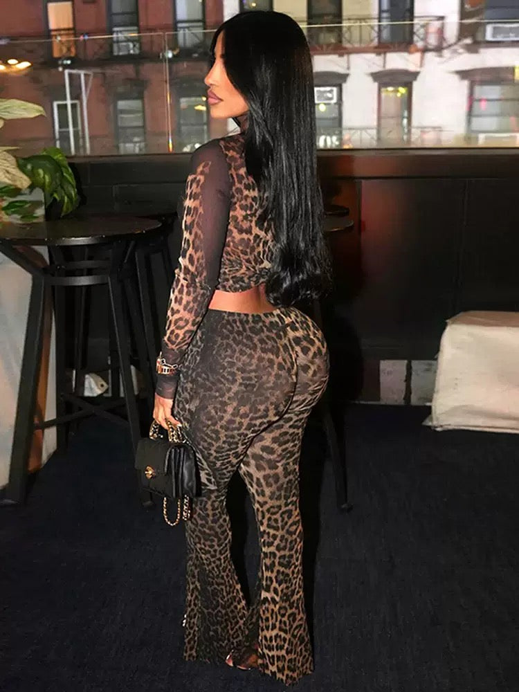 Unleash your wild side with this bold two-piece set, designed for fashion lovers who love to stand out. The outfit includes a long-sleeve sheer top with a fitted silhouette and a high neckline, paired with matching high-waist flared pants that accentuate your curves. The soft, stretchy fabric ensures a comfortable and flattering fit, while the all-over animal print adds a daring and trendy edge.