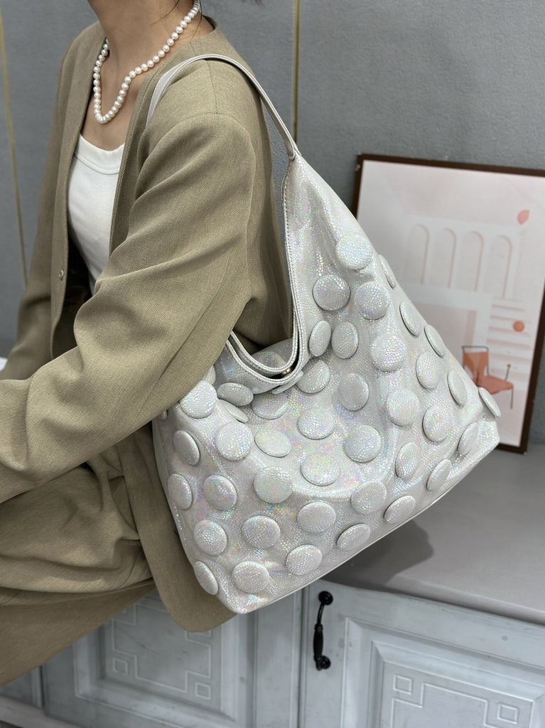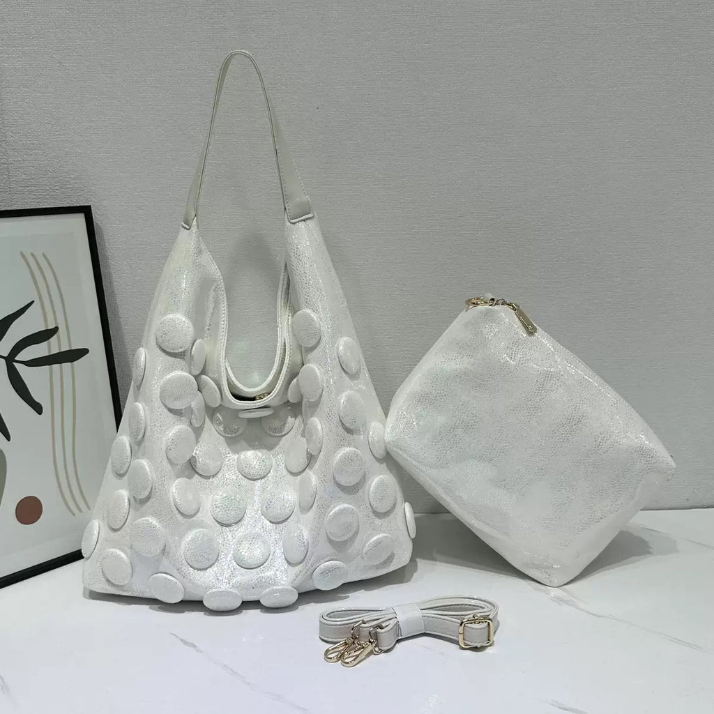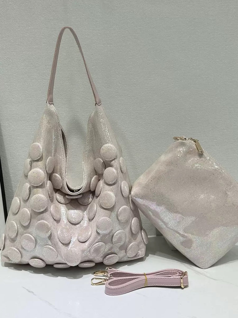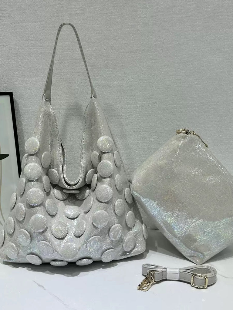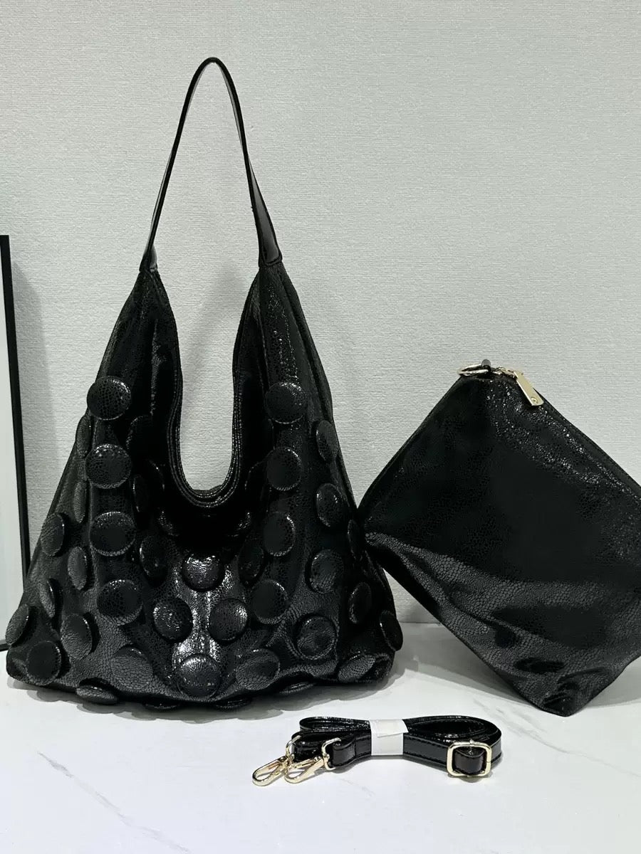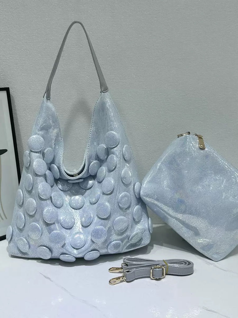 Elevate your everyday style with this chic bubble textured hobo bag 3-piece set. The large slouchy hobo tote features a unique raised bubble (3D polka dot) texture that adds playful dimension and eye-catching appeal, perfect for fashion-forward women seeking a standout accessory. Crafted with a glossy, iridescent-like finish, this spacious shoulder bag offers ample room for daily essentials while maintaining a soft, relaxed silhouette.
