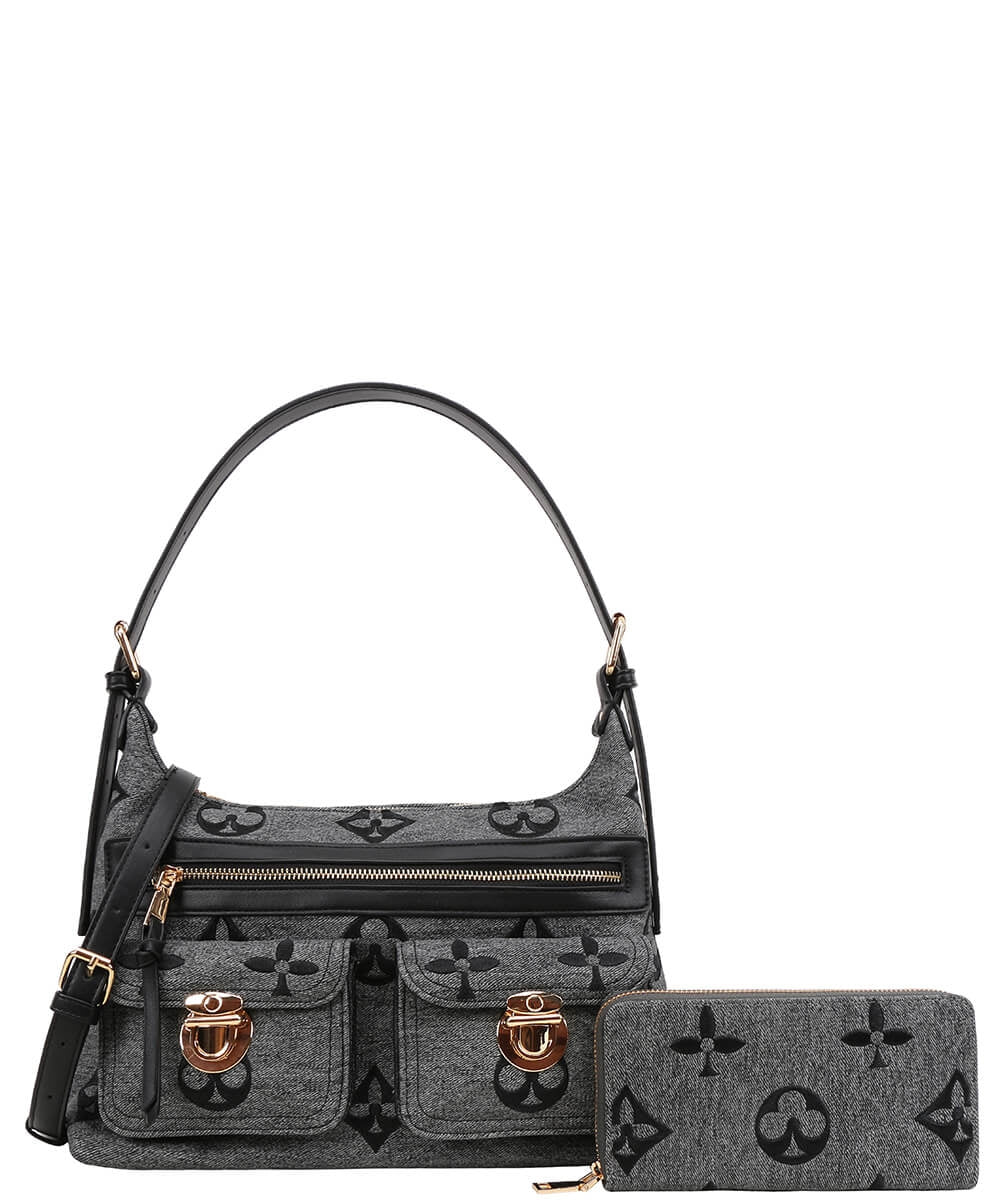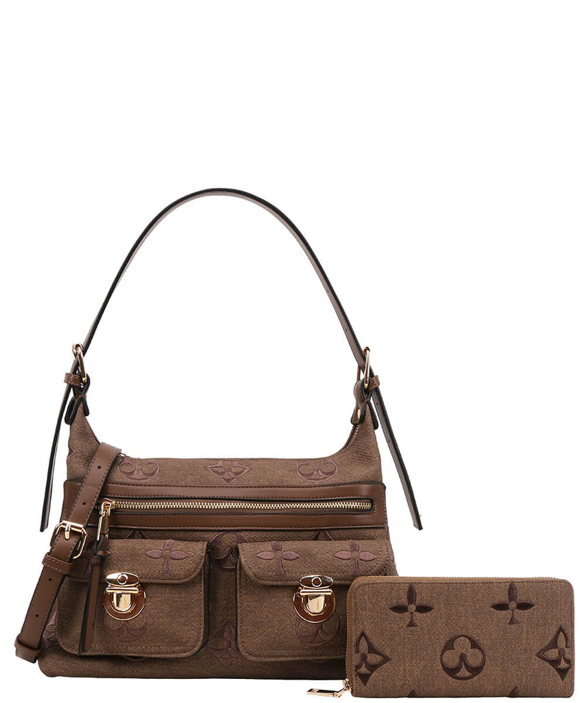Elevate your everyday style with this chic patterned shoulder bag and wallet set. The shoulder bag features a structured silhouette with dual front flap pockets secured by polished buckle closures, a top zipper compartment for quick access, and an adjustable strap for versatile carrying. Its spacious design makes it ideal for daily use while adding a modern, stylish touch.