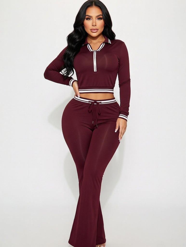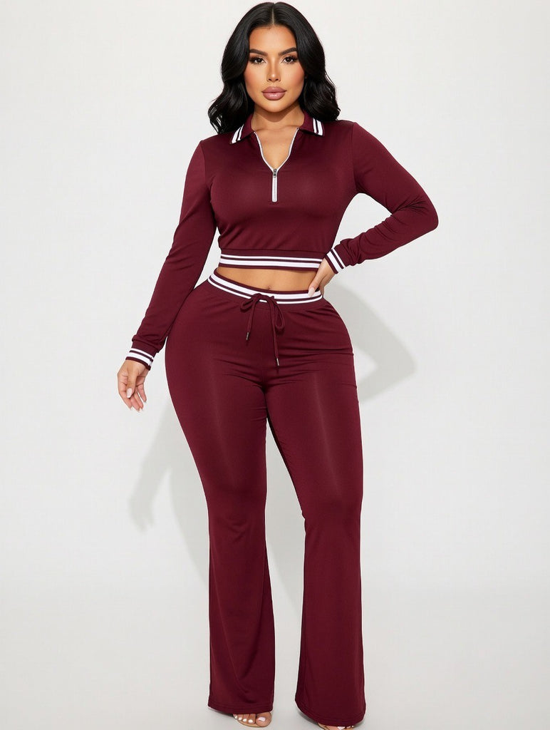 The cropped long-sleeve zip-up top features a collared neckline, sleek zipper front, and contrast striped trim for a sporty-chic vibe that flatters your figure. Paired with high-waisted flare pants that offer a relaxed yet fitted silhouette, complete with an adjustable drawstring waist and matching striped cuffs for effortless coordination.