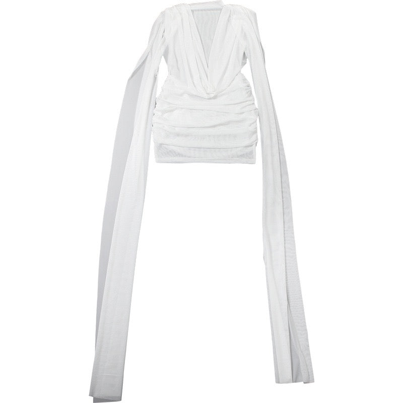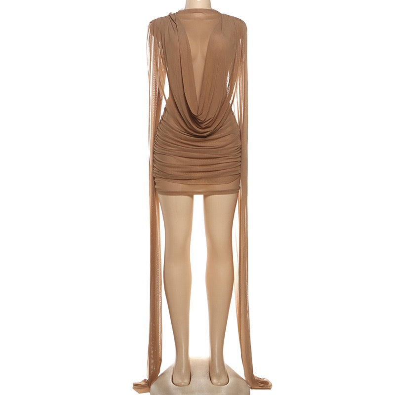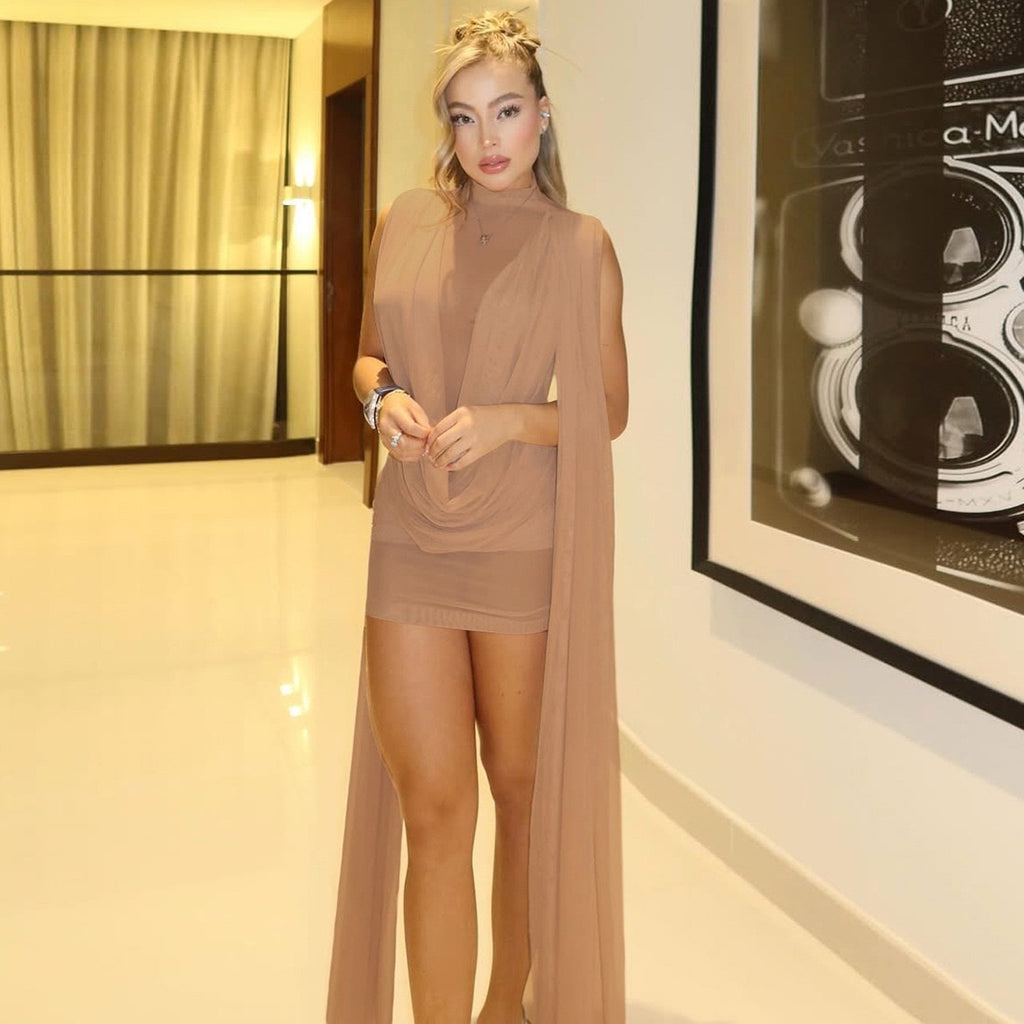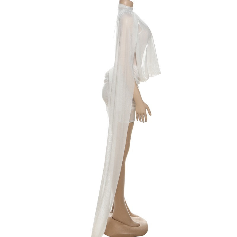 Make a dramatic entrance in this ethereal two-piece set featuring a ruched mesh mini dress paired with flowing cape-style sleeves for a romantic, show-stopping silhouette.