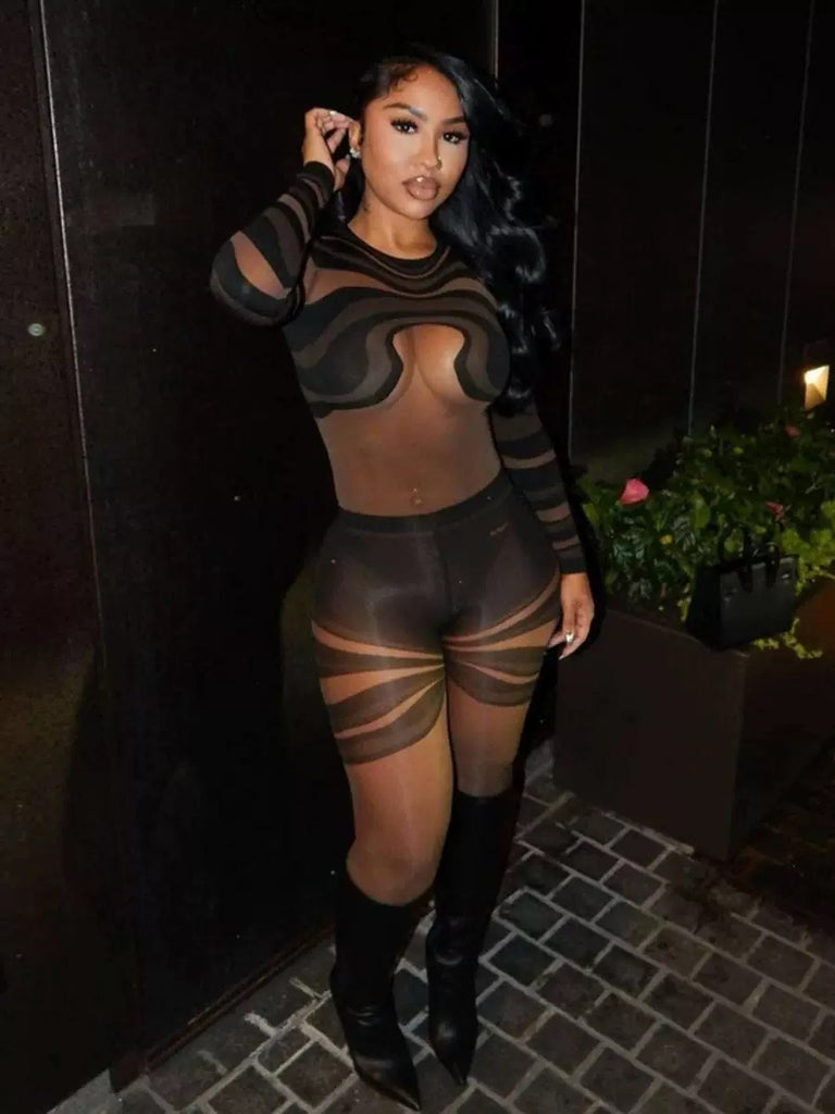 Seductive and daring, this sheer mesh jumpsuit features a form-fitting silhouette with bold horizontal stripes and strategic cut-out patterns that highlight your curves with every movement.