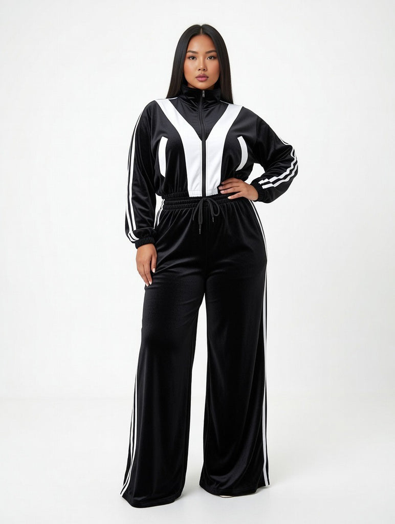 Elevate your athleisure game with this women’s wide leg tracksuit set – the perfect blend of sporty style and effortless comfort. Featuring a sleek zip-up jacket with a high mock neck collar and contrast side panels for a bold, athletic look, paired with ultra-relaxed wide-leg pants that offer a flattering drape and easy movement.