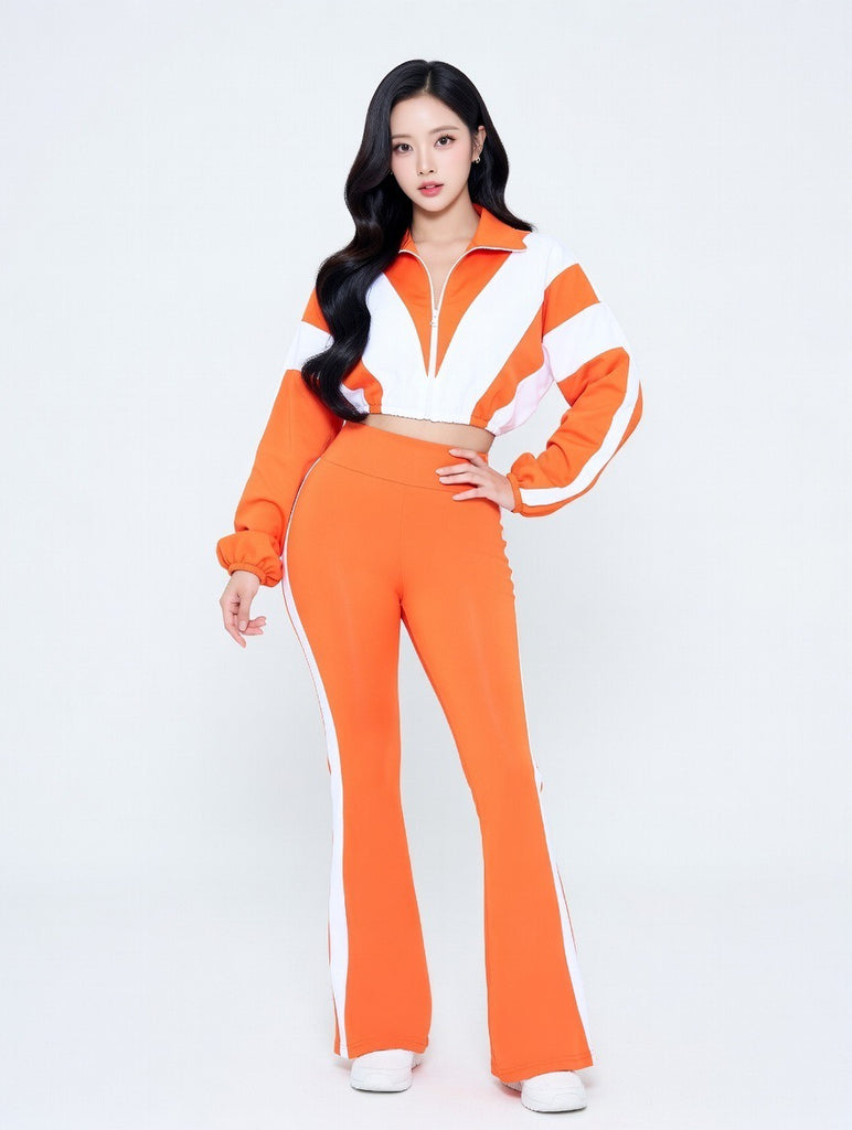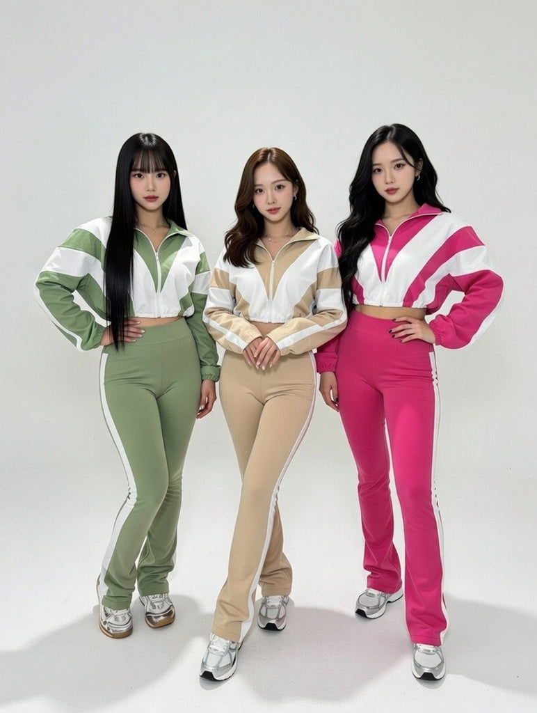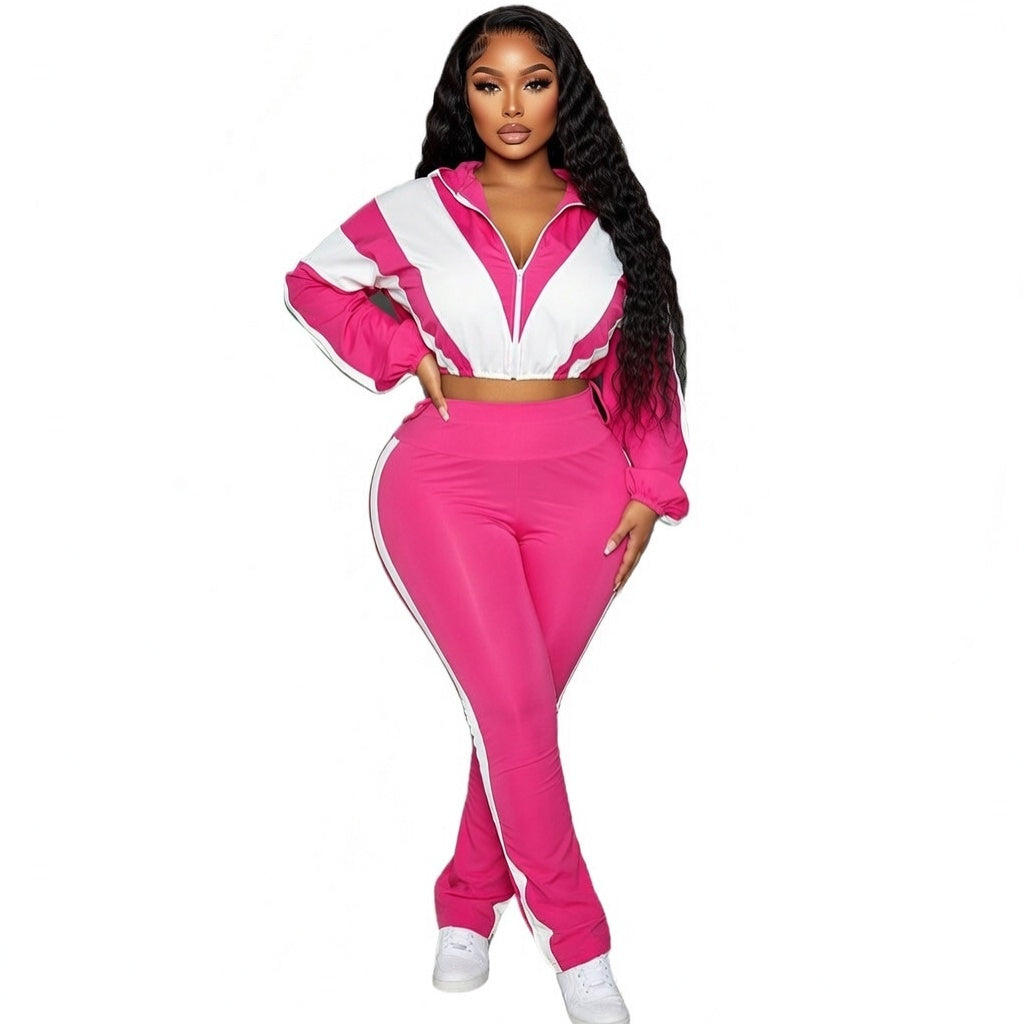 This stylish two-piece set features a cropped zip-up jacket with a bold panel design and a flattering high-waist jogger pant. The jacket includes a stand collar and elastic cuffs for a sporty vibe, while the matching fitted pants offer a sleek silhouette with subtle stripe accents on the sides. Perfect for casual days, athleisure wear, or running errands in style.