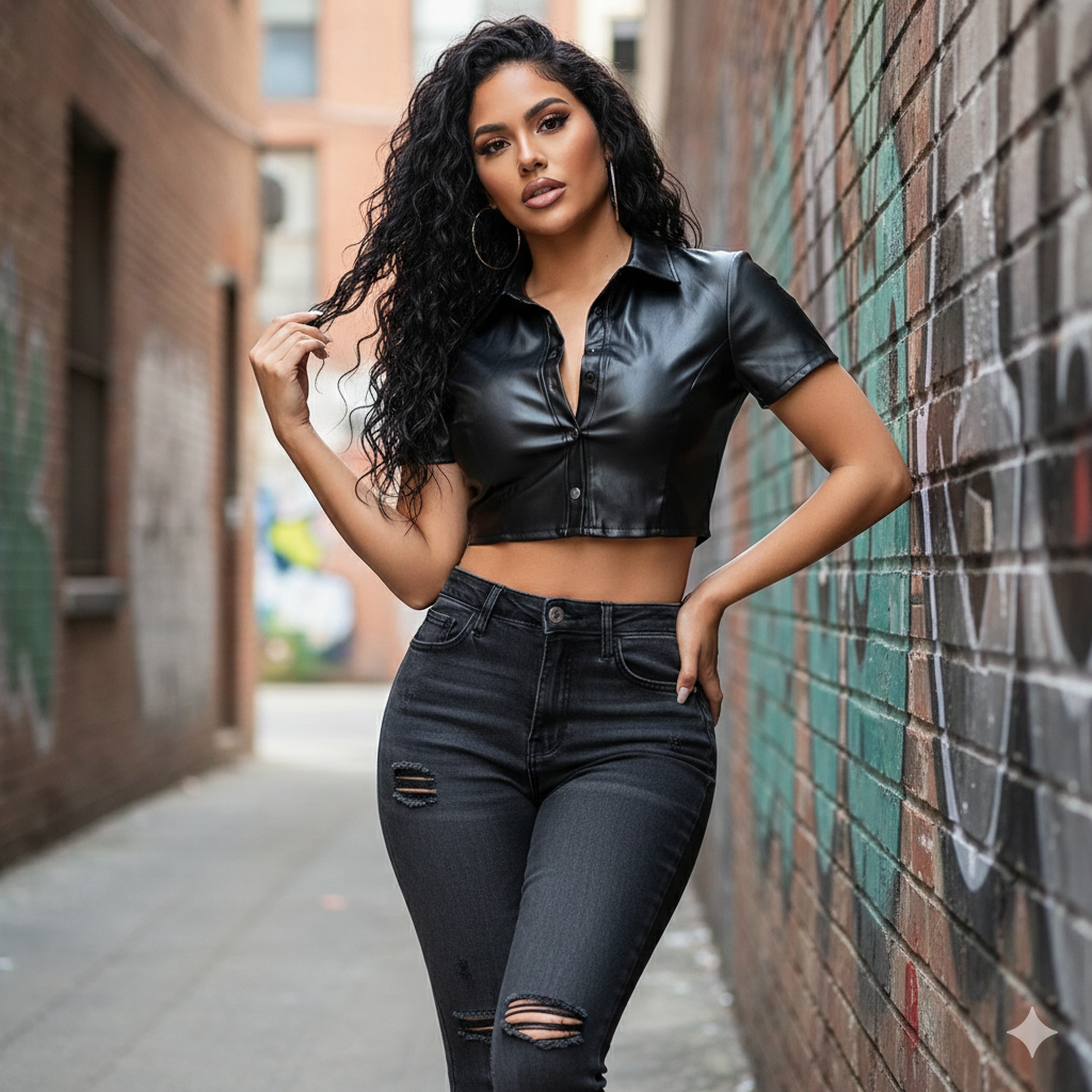 This cropped, short-sleeve shirt boasts a fitted and sleek design. Its classic collar and front row of snap buttons give it a bold, modern edge. With a slight sheen, the material exudes sophistication and confidence. A versatile piece for layering or making a statement, it's a must-have for anyone seeking to inject their wardrobe with a touch of daring style.