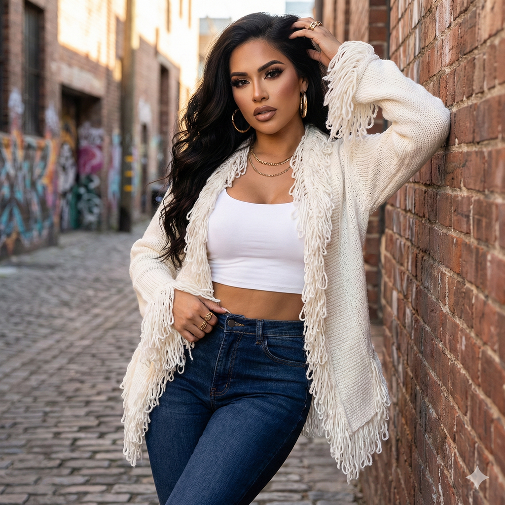 This long-sleeved cardigan, shown in the photo, boasts an open-front design and a chunky knit pattern. The most striking feature is the thick fringe detail that adorns the collar, front edges, and hemline. With a loose and relaxed fit, this sweater exudes a cozy and casual vibe. The visible knit pattern adds depth and a handmade touch to the overall bold and trendy style, perfect for making a statement.