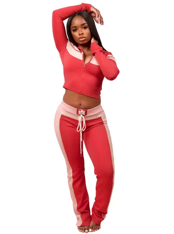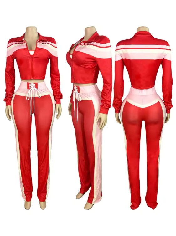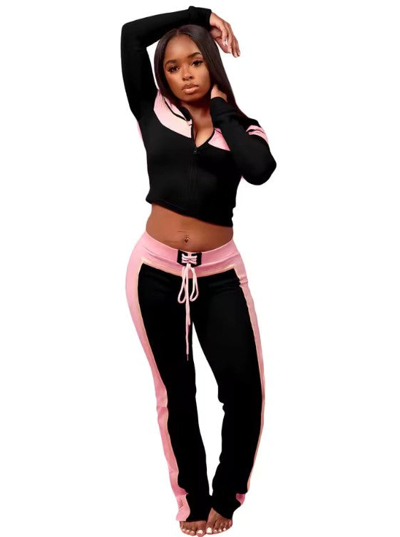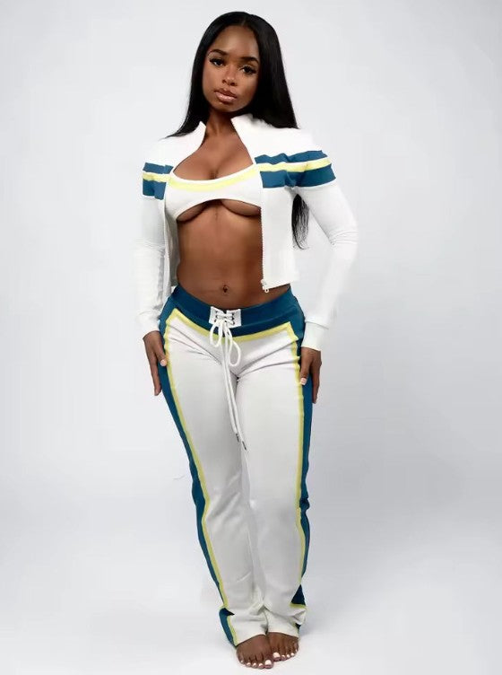 Make a bold statement with this stylish 2-piece outfit featuring a zip front long sleeve crop top and matching high waist pants. The crop top is designed with sleek stripe detailing across the chest and sleeves for a sporty, eye-catching look. The coordinating pants include a lace-up waistband accent and stripe paneling down the sides, creating a flattering silhouette that elongates the legs.