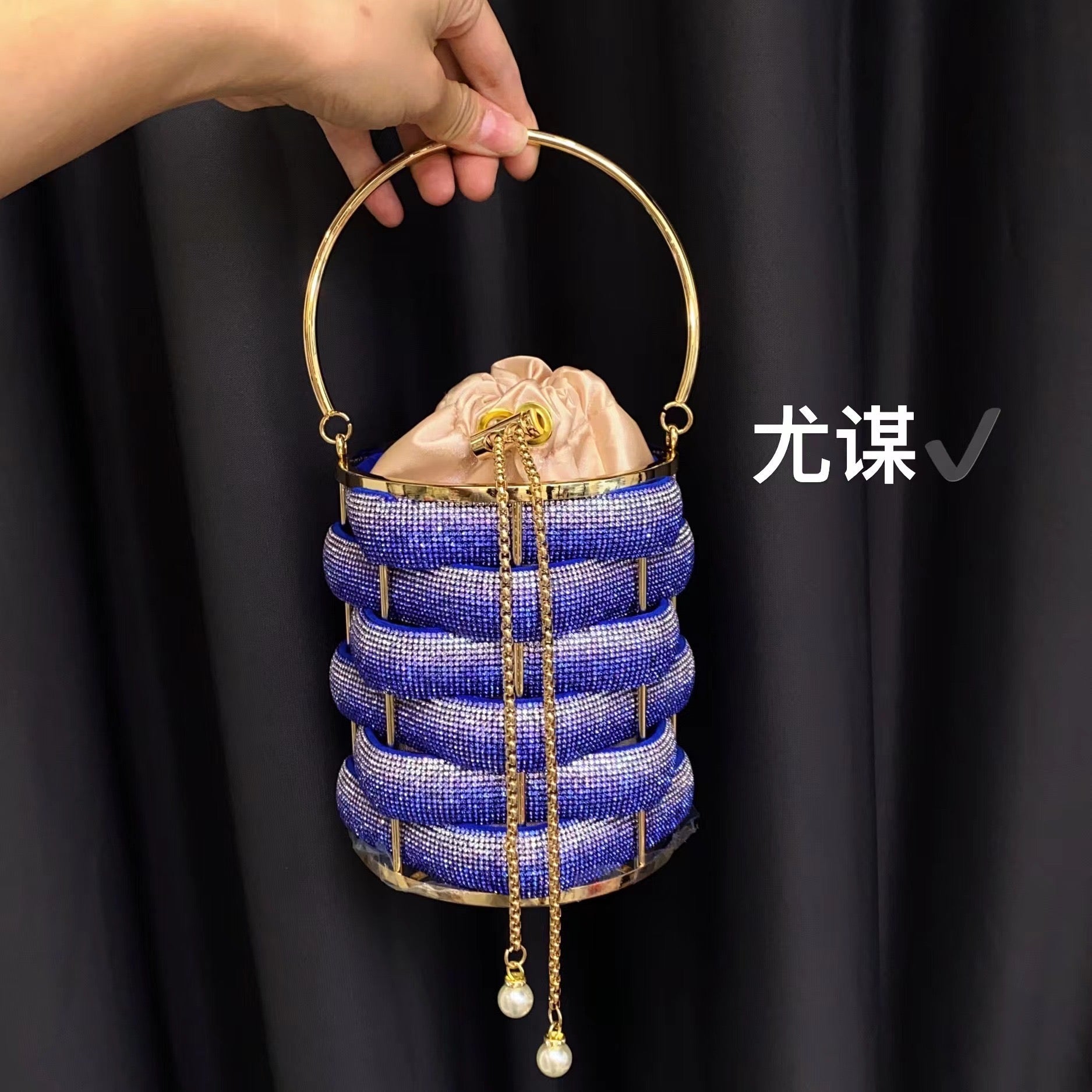 Add a bold touch of luxury to your evening look with this intricately designed cylinder-shaped evening bag. Featuring a shimmering beaded exterior and vertical structural bands, this bag stands out with its sculptural elegance. The satin drawstring pouch lining adds a touch of softness and security for your essentials, while the delicate pearl chain detail adds a glamorous finish.