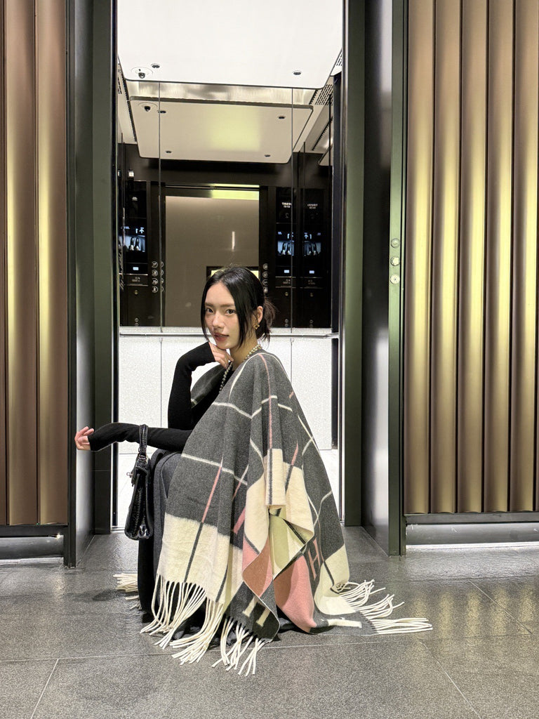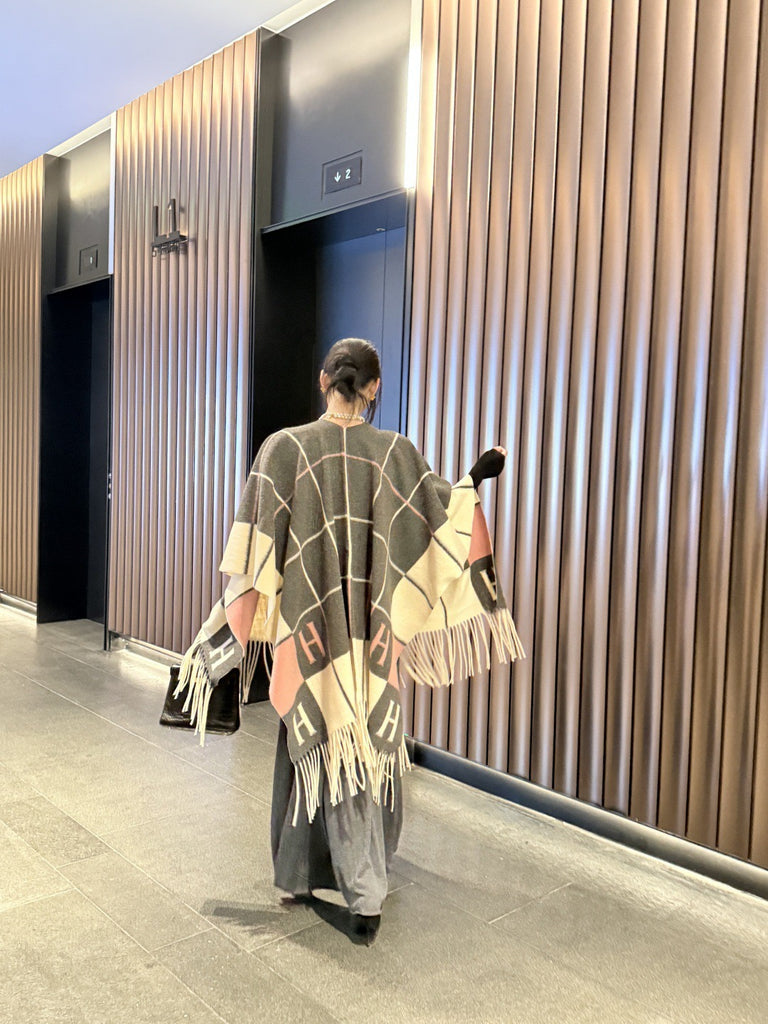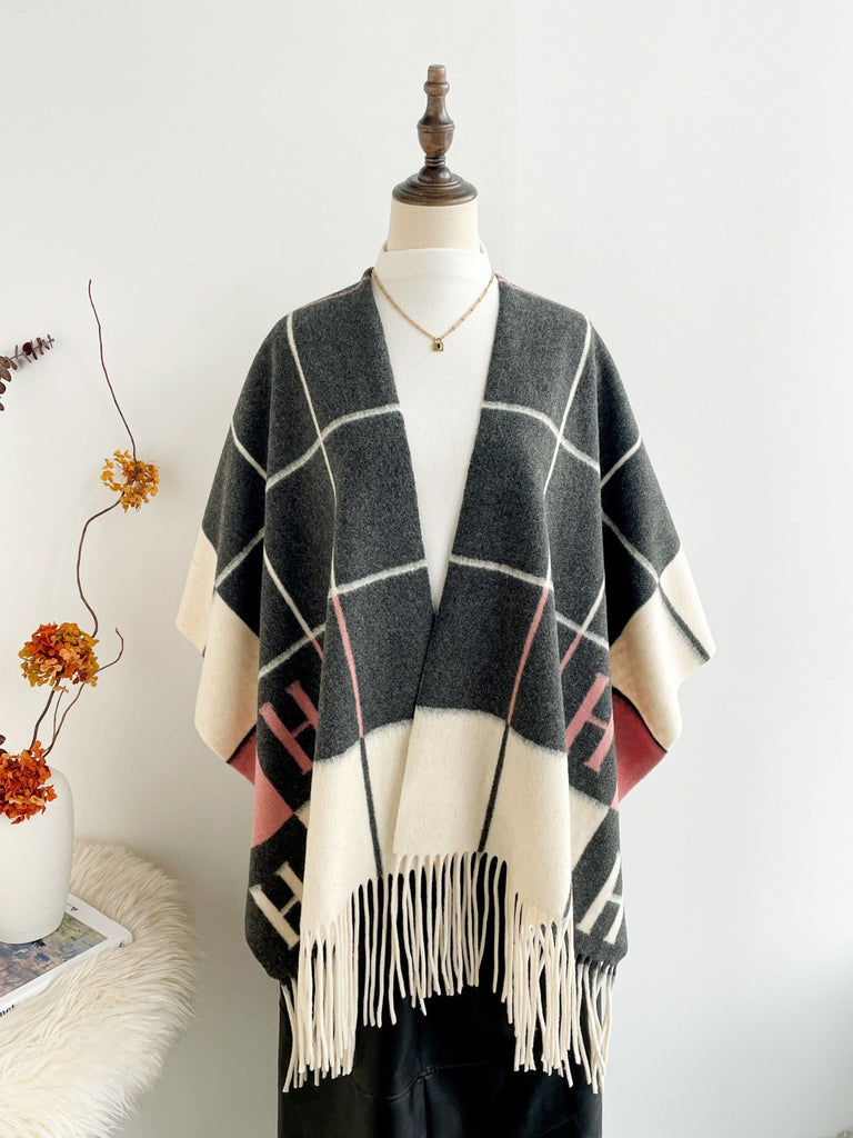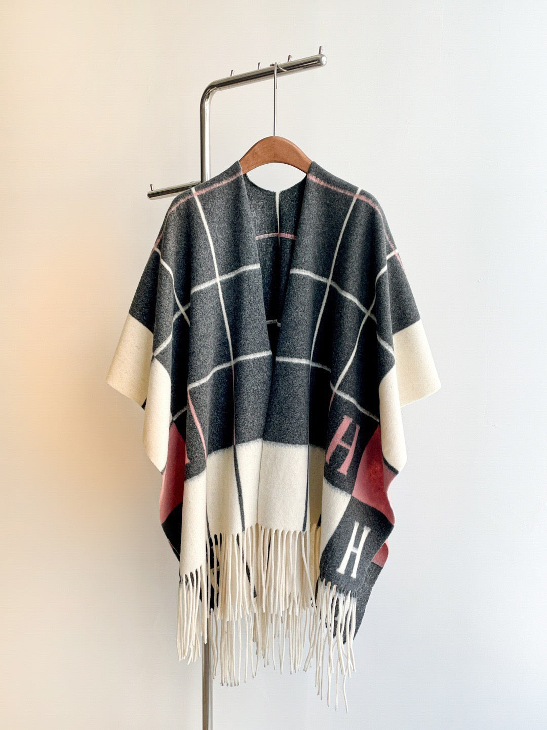 Wrap yourself in comfort and style with this elegant checkered poncho. Featuring a soft, draping silhouette with an open front and fringed hem, this piece adds a sophisticated yet relaxed touch to any outfit. The bold geometric pattern and classic design make it a standout accessory for layering over casual or dressy looks.