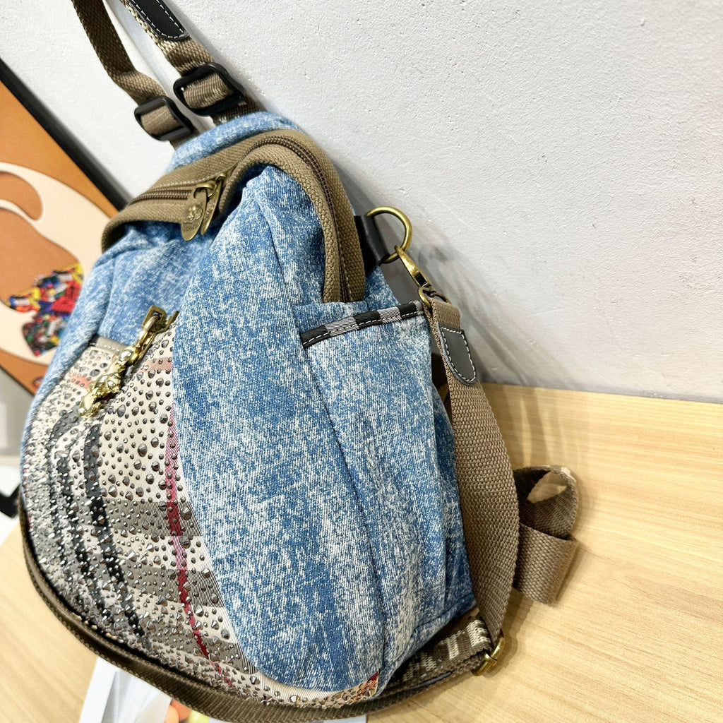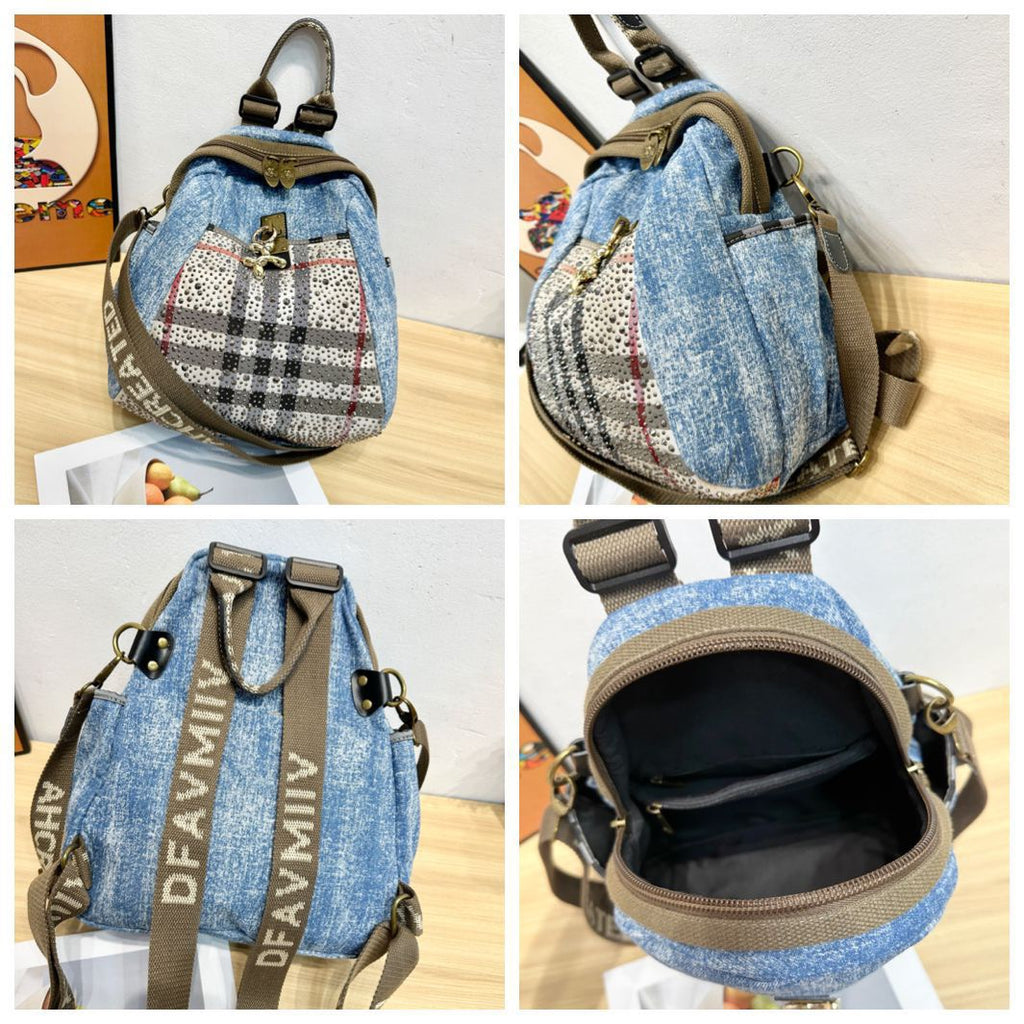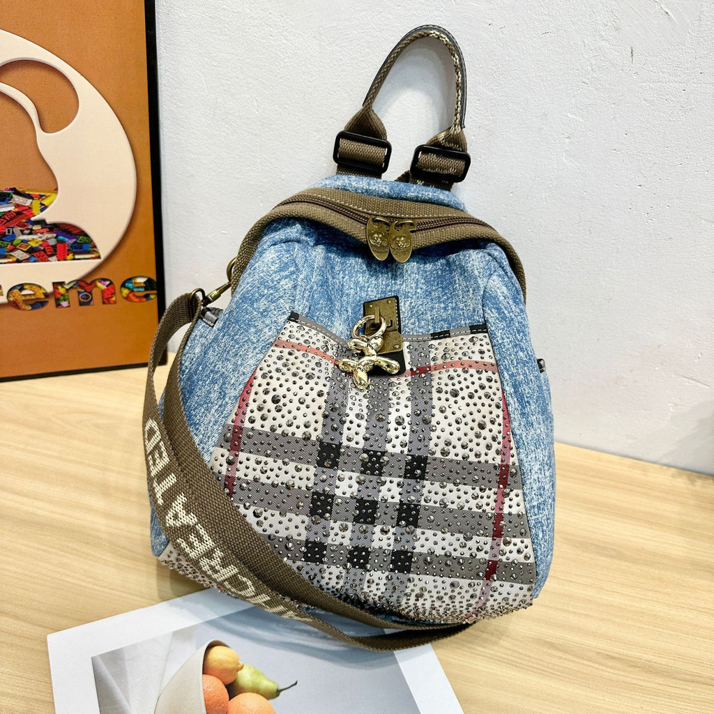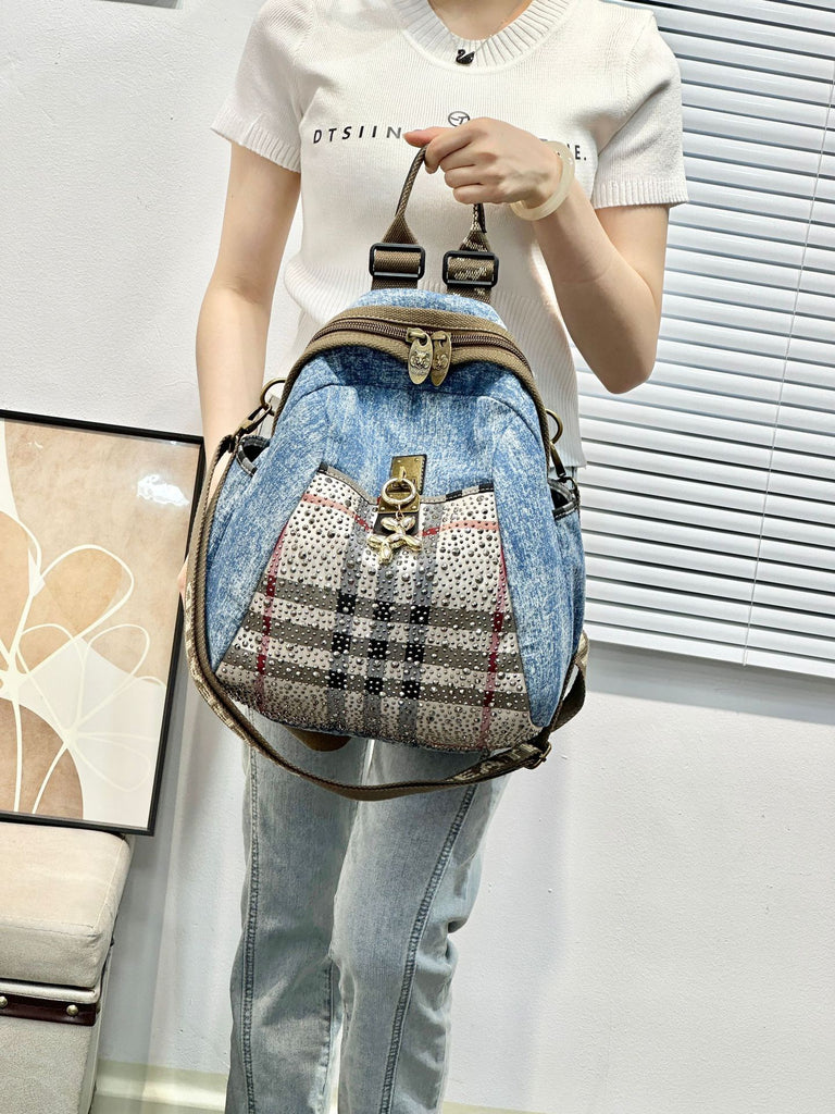 Carry your essentials in style with this fashionable denim backpack featuring an embellished plaid front panel for a unique, eye-catching look. This bag blends casual denim with sparkling rhinestone accents, creating the perfect mix of everyday comfort and standout fashion.