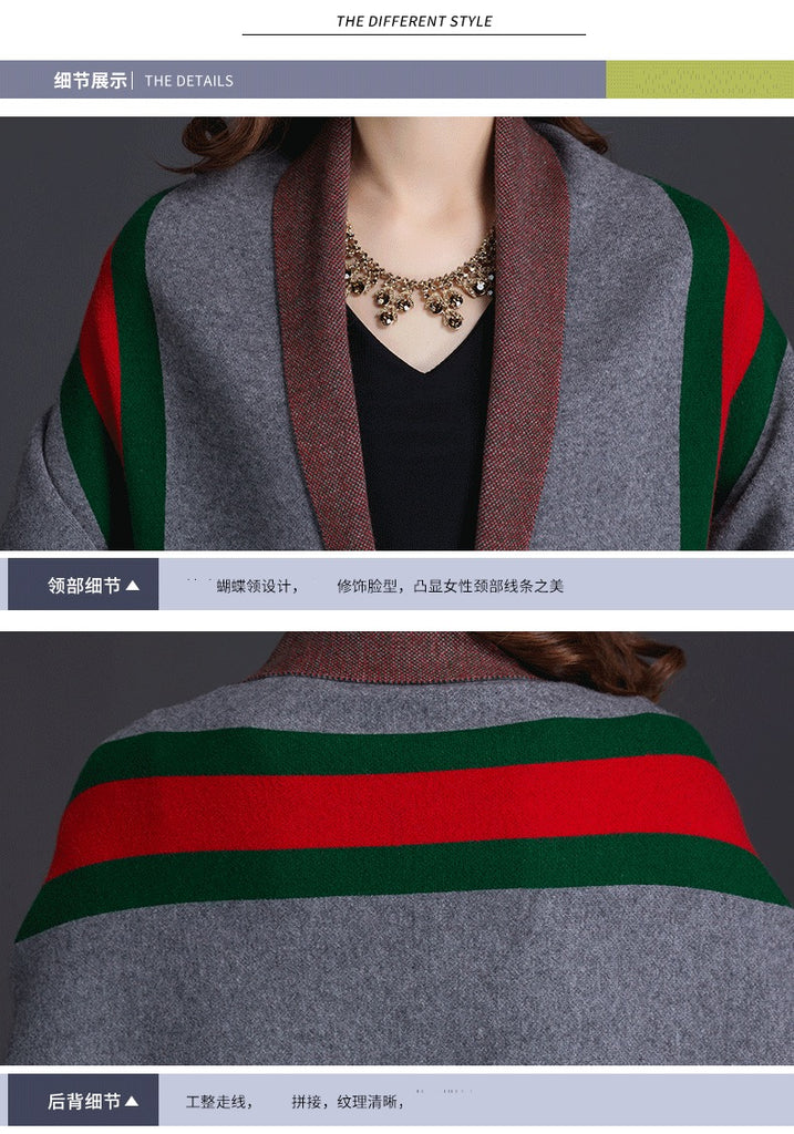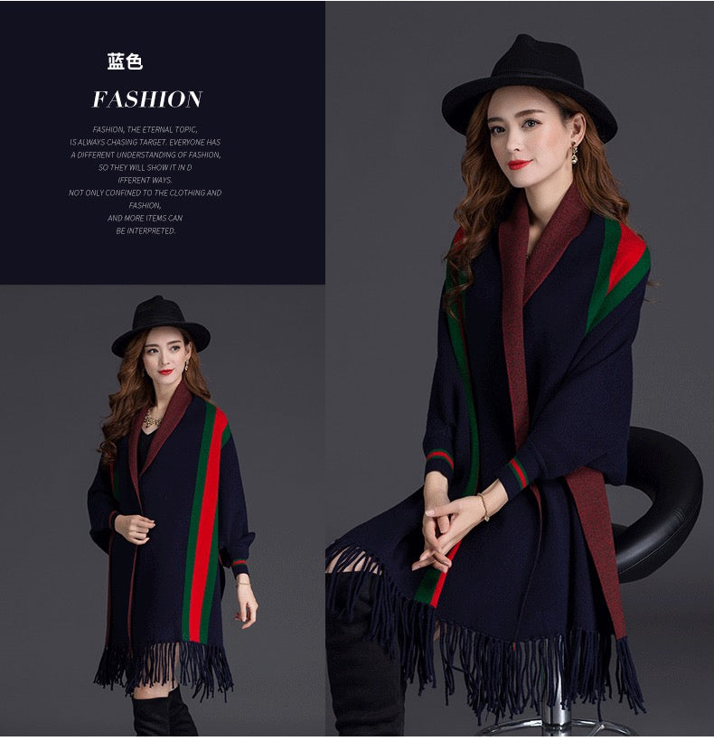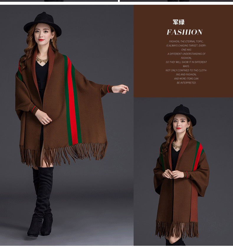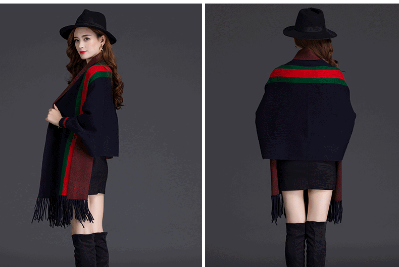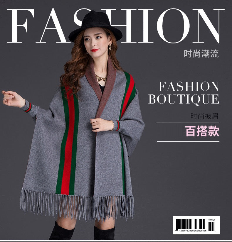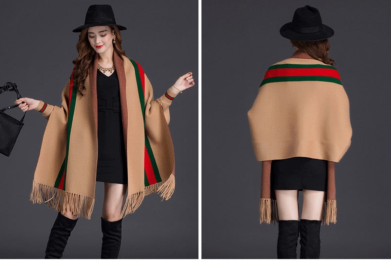 Every Fashion Elegant Fringe Trim Poncho Wrap with Classic Stripe Accent