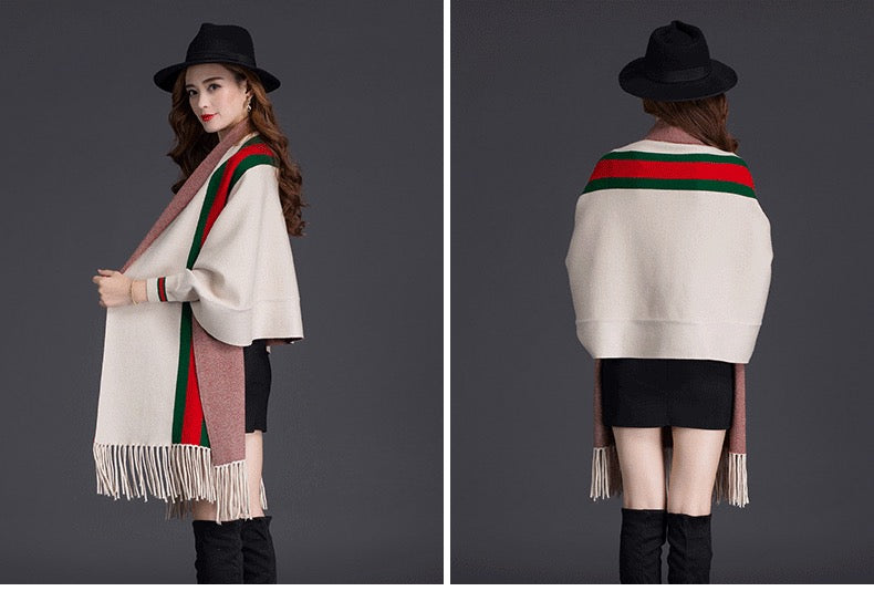 This stylish poncho wrap adds effortless sophistication to any outfit. Designed with a relaxed drape, open front, and fringed hemline, it offers a flattering silhouette that moves gracefully with every step. The soft, mid-weight fabric keeps you cozy while maintaining a chic, structured look. Its timeless stripe detail adds a refined touch, making it perfect for pairing with jeans, boots, or dresses for an elevated casual or evening style.