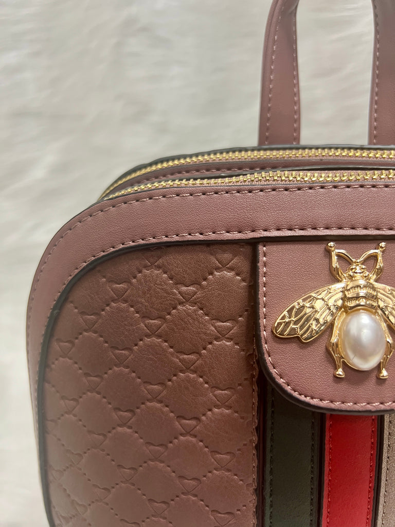 This stylish backpack combines elegance and practicality with a unique embossed pattern and a bold stripe detail down the center. Accented by a sophisticated bee emblem with a pearl centerpiece, this design delivers a chic yet functional look.