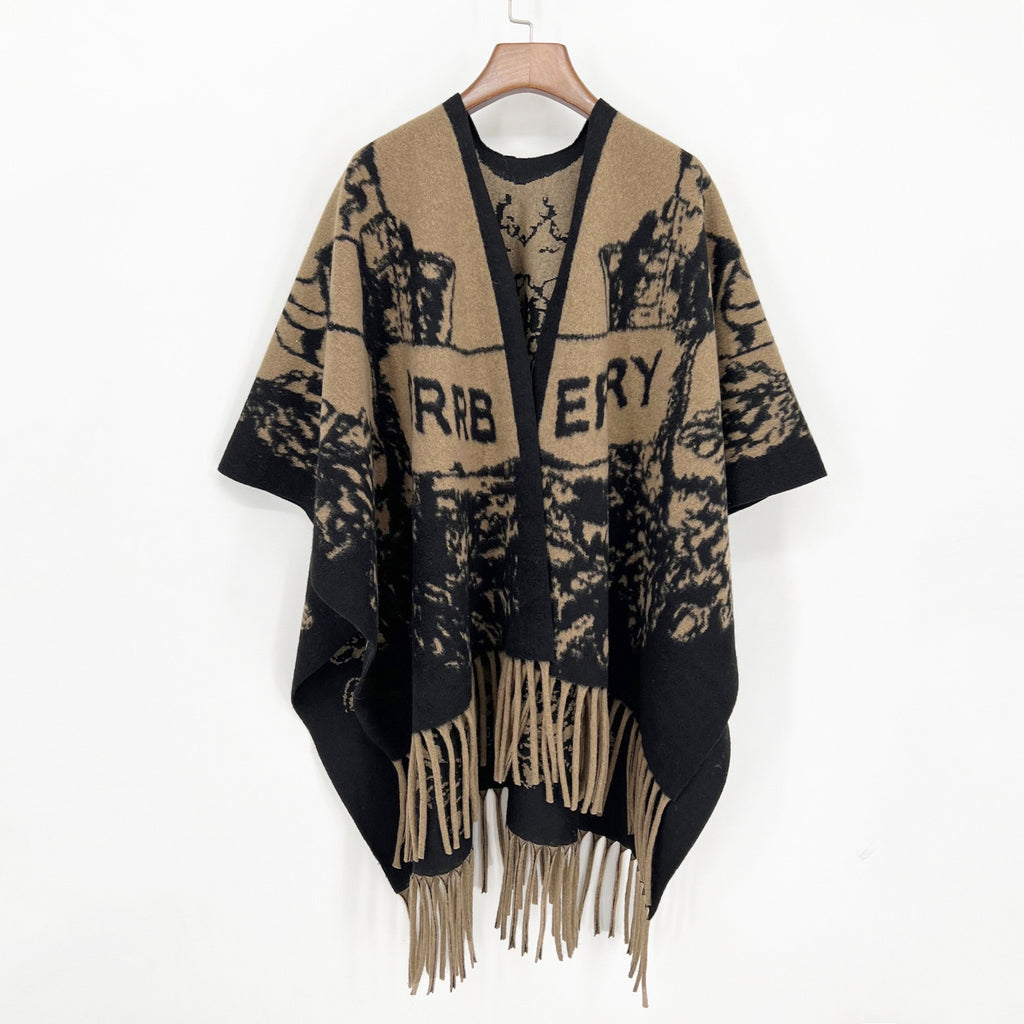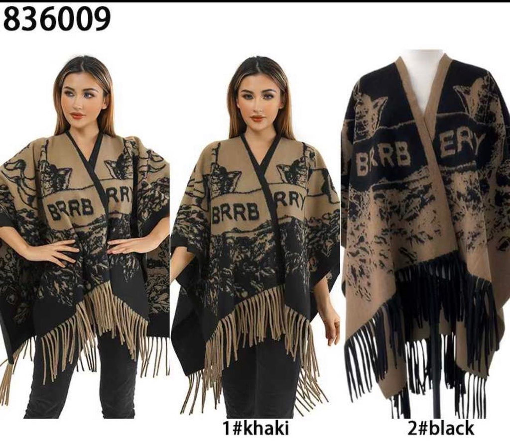 Every Fashion Fringe Hem Graphic Knit Poncho Wrap