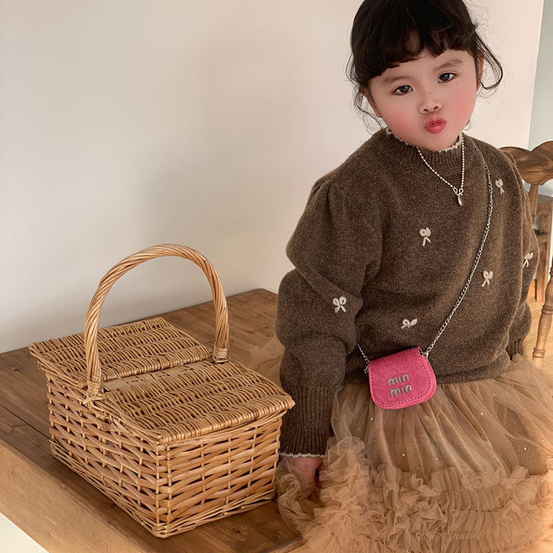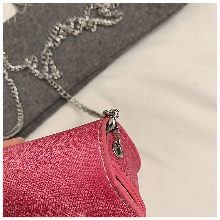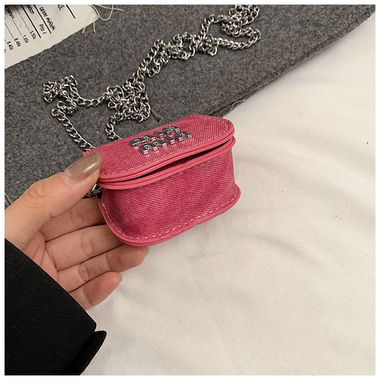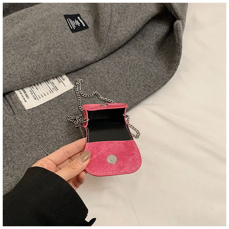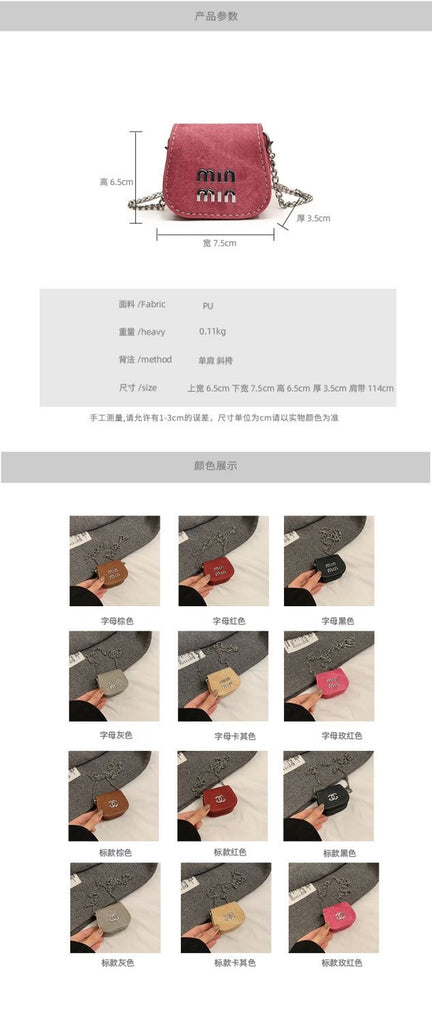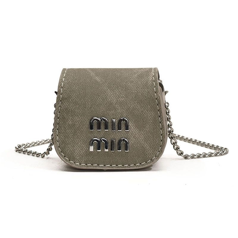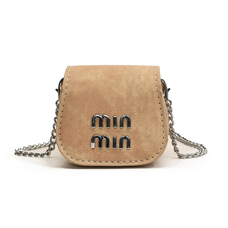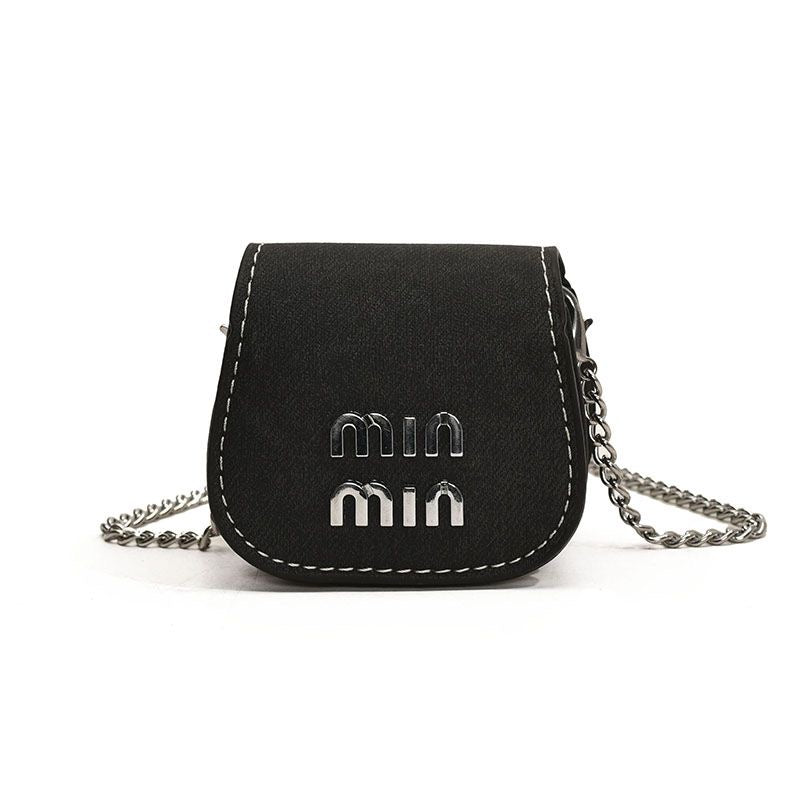 Add a playful edge to your accessories collection with this mini flap crossbody bag. Designed with a compact silhouette, it features a secure flap closure and a sleek chain strap for versatile carrying. The structured body is complemented by bold “min min” metallic lettering on the front, giving it a trendy statement look.