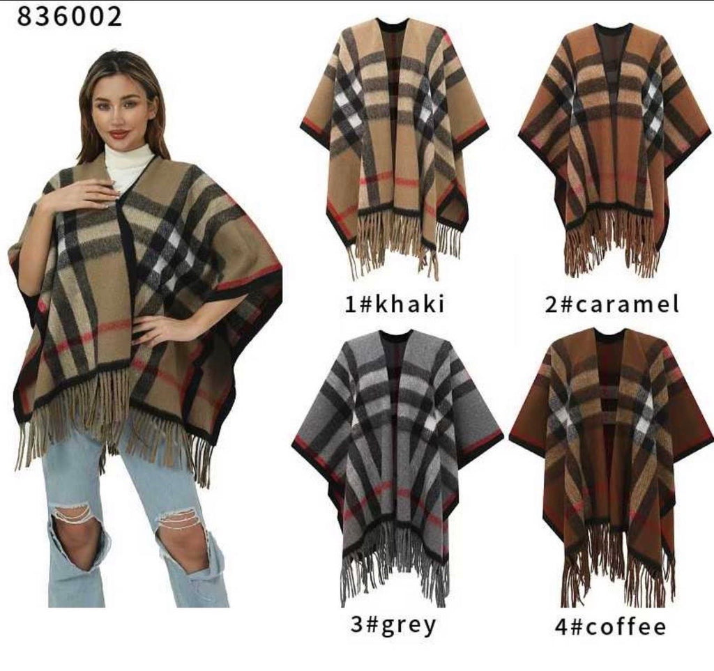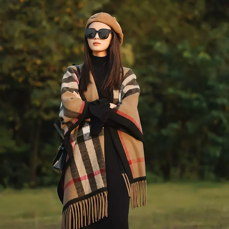 Elevate your cold-weather wardrobe with this timeless plaid poncho wrap. Designed with a classic checkered pattern and finished with soft fringe detailing along the hem, it combines warmth, comfort, and effortless style. The open-front silhouette allows for easy layering over sweaters, turtlenecks, or long-sleeve tops, making it a versatile piece for both casual and dressy occasions.