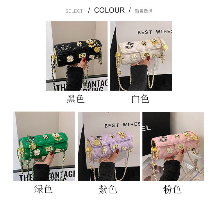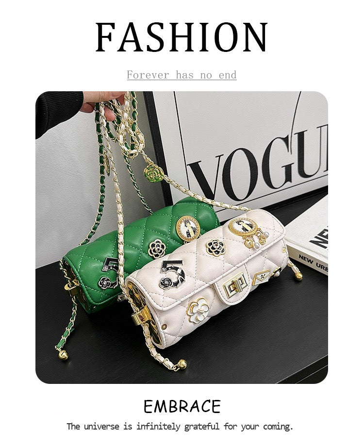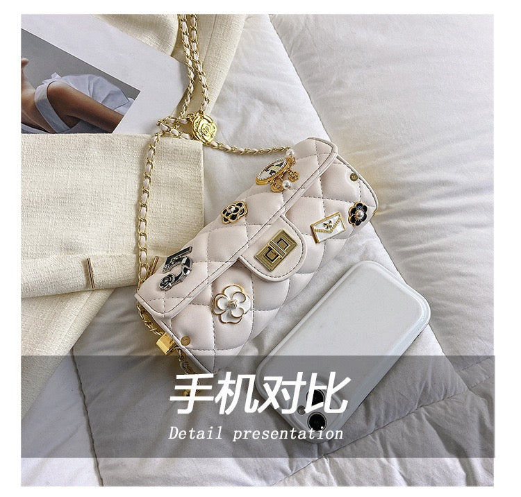 The front flap is embellished with assorted decorative charms, giving the bag a unique, personalized feel. A sleek turn-lock closure keeps your essentials secure, while the chain shoulder strap offers a polished, sophisticated finish. Perfect for date nights, special events, or elevating your everyday outfits.