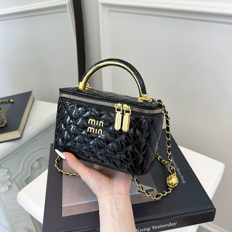 Every Fashion Quilted Patent Box Handbag with Top Handle and Chain Strap