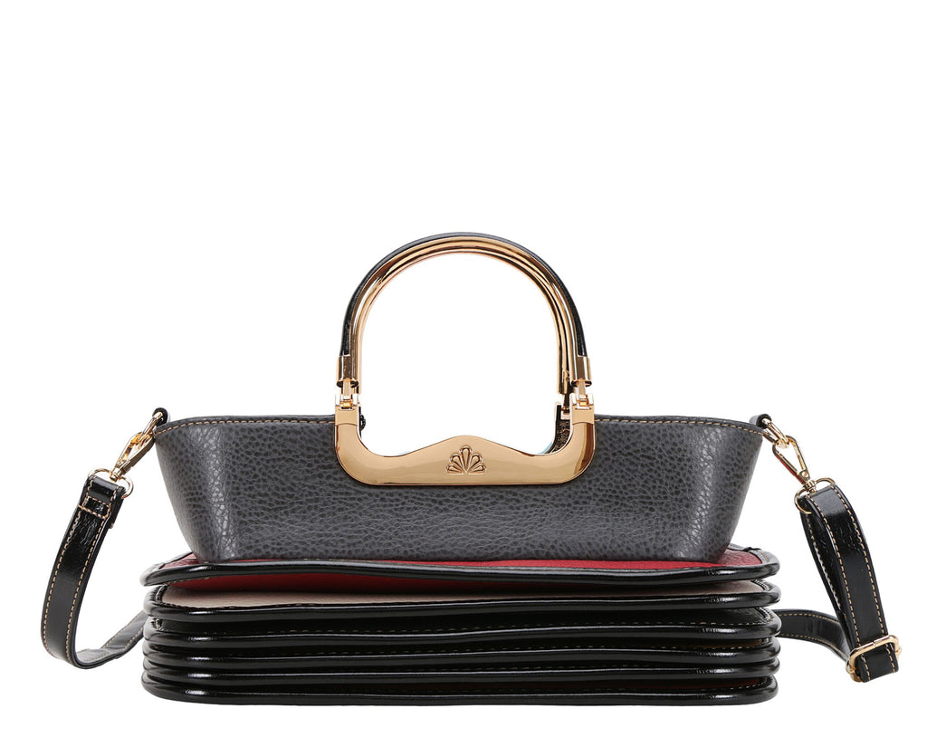 This handbag features a striking stacked-layer design that sets it apart as a bold fashion statement. Its unique structure combines multiple panel layers with a sleek silhouette, making it both functional and eye-catching. The polished metal top handle adds a touch of sophistication while offering a sturdy grip, complemented by a detachable strap for versatile styling options.