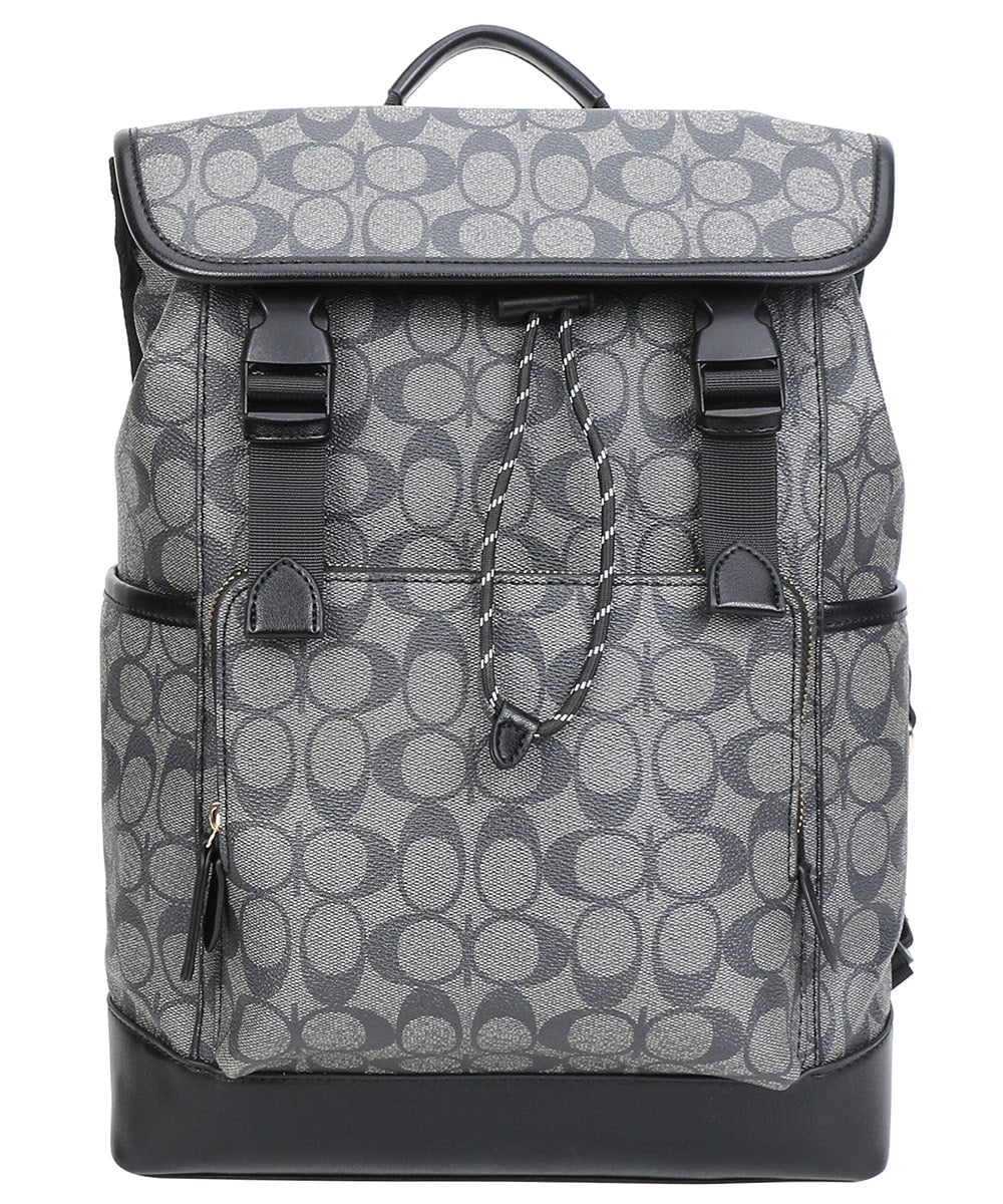 This structured backpack blends classic design with modern utility, featuring an all-over signature pattern for a timeless look. The flap top is secured with dual buckle closures and a drawstring for added security. Designed with multiple compartments, including side pockets and an easy-access front pocket, this backpack offers both organization and convenience. The reinforced bottom provides durability, while the top handle and adjustable shoulder straps allow versatile carrying options. Perfect for daily commutes, travel, or casual wear, this backpack combines functionality with refined style.