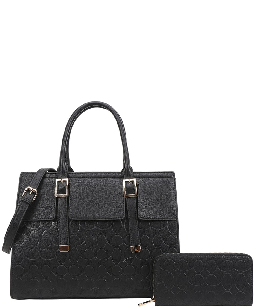 Elevate your everyday look with this sophisticated structured tote bag, paired with a matching zip wallet for a polished set. The tote features a patterned exterior with sleek buckle strap detailing on the front, adding a refined touch. Designed with dual top handles and a detachable shoulder strap, it offers versatile carrying options for work, errands, or travel.