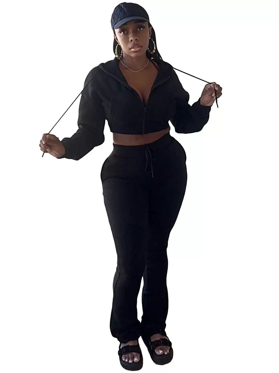 - Two-piece lounge set: cropped hoodie + flare sweatpants