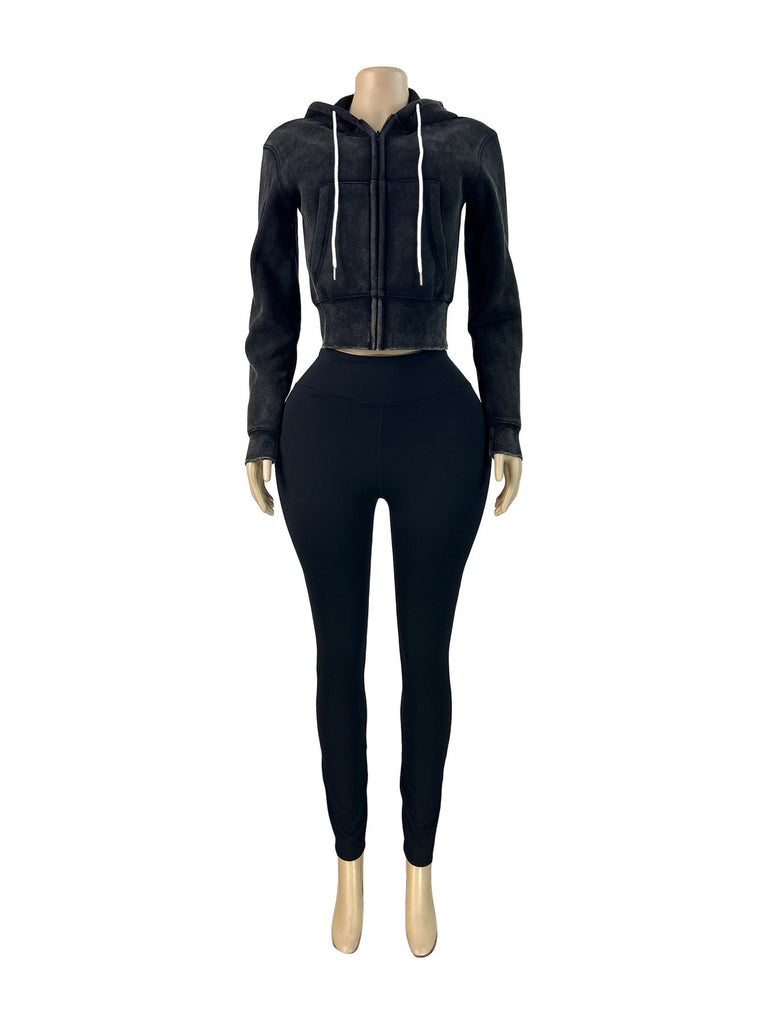 - Two-piece set: cropped zip-up hoodie + high-waist leggings