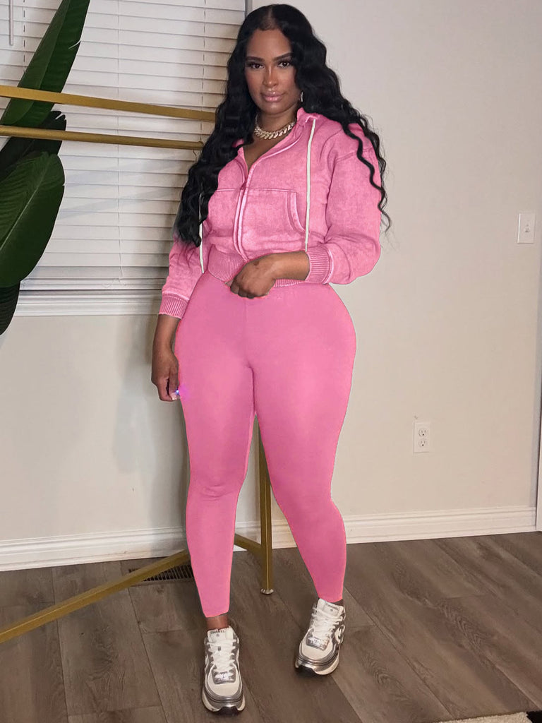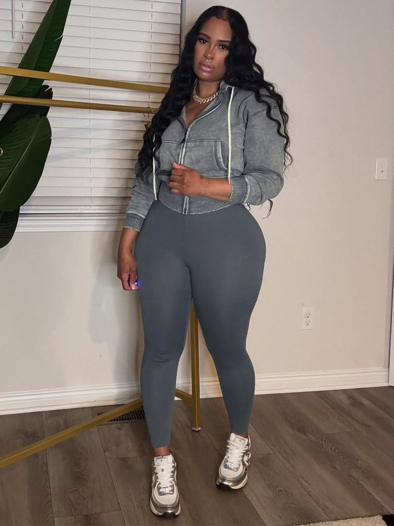 Stay comfy and stylish in this casual two-piece lounge set designed for everyday wear. The outfit includes a cropped zip-up hoodie paired with matching high-waist leggings, offering a flattering, form-fitting silhouette perfect for both relaxing and running errands.