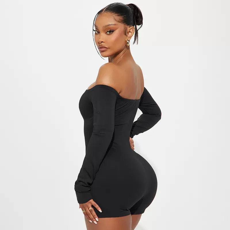 Turn up the heat with this daring cut-out off-shoulder bodycon romper. Designed to hug every curve, it features a bold lattice-style front with eye-catching cut-out detailing that adds a sultry, statement-making touch. The off-shoulder neckline and long sleeves enhance the sleek, sexy silhouette, while the stretchy, form-fitting fabric ensures a flattering and comfortable fit.