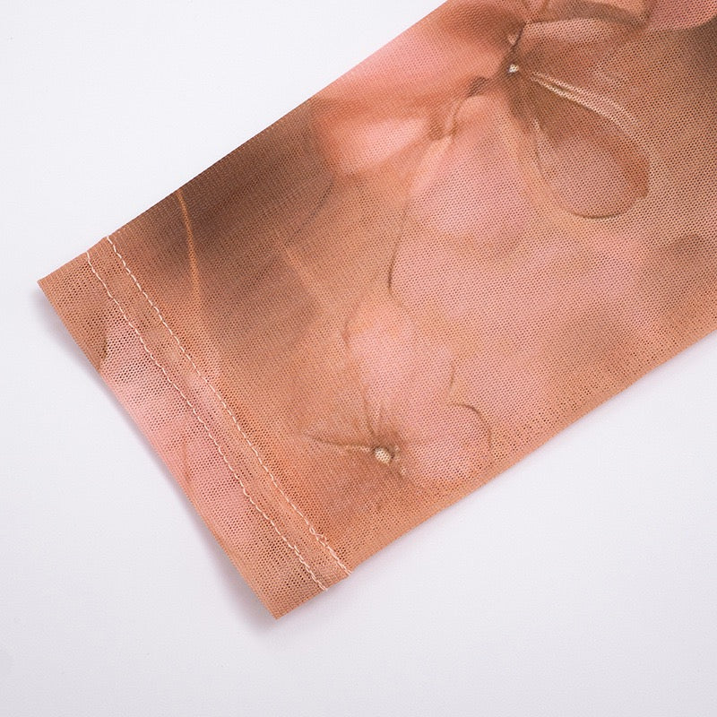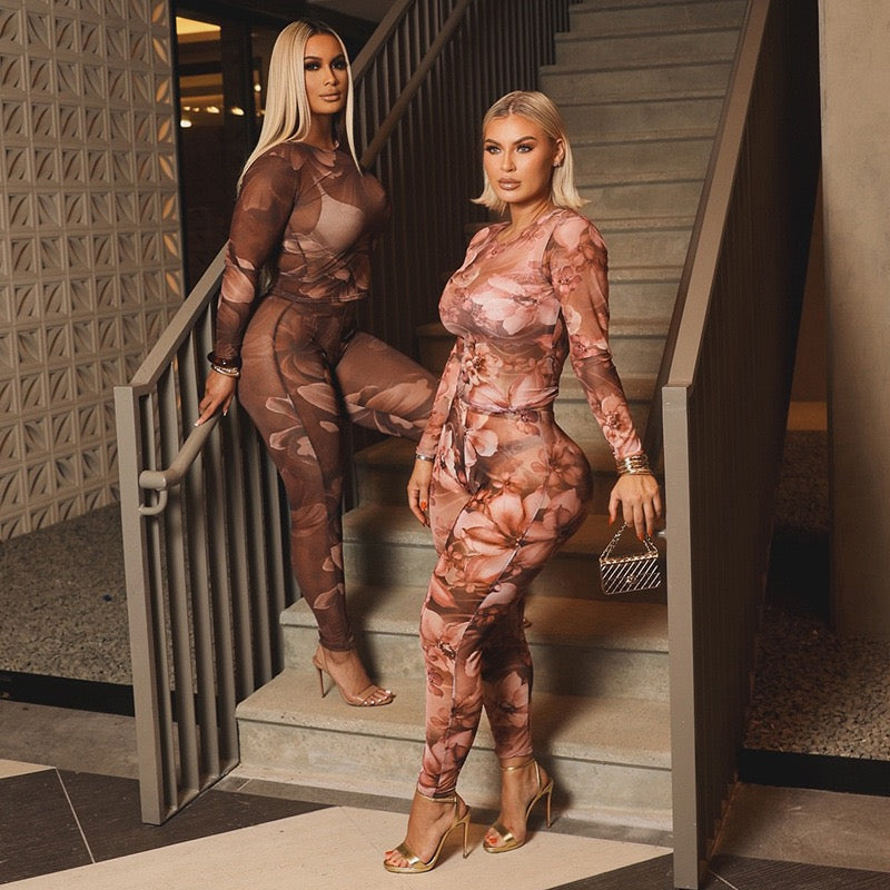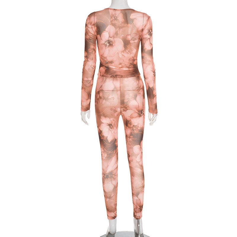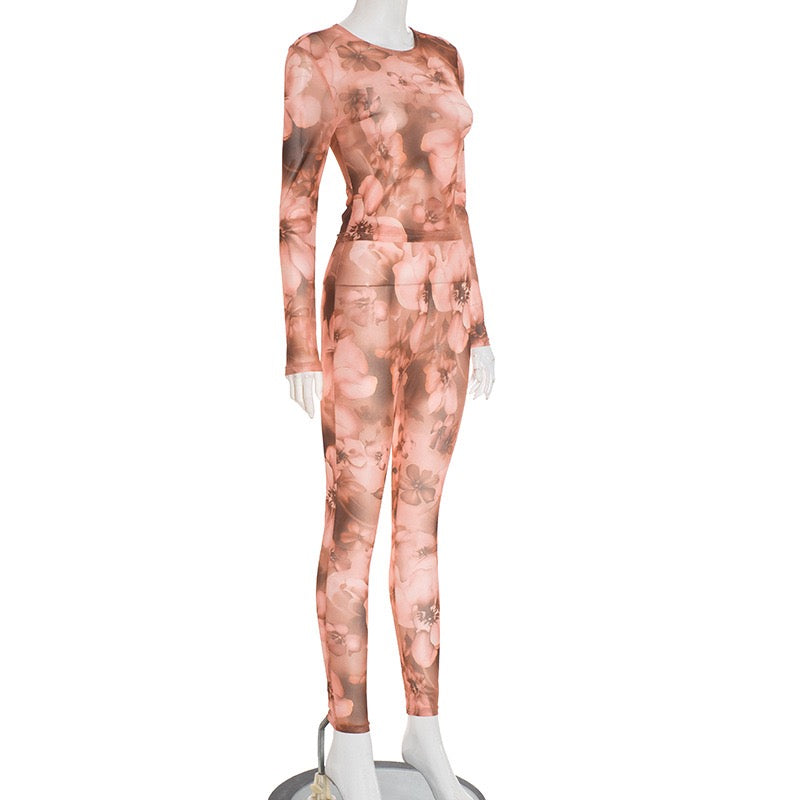 This floral mesh two-piece set brings effortless elegance and modern edge to your wardrobe. The outfit includes a fitted long-sleeve top and matching high-waist leggings, both crafted from lightweight, stretchy mesh fabric that contours beautifully to your shape.