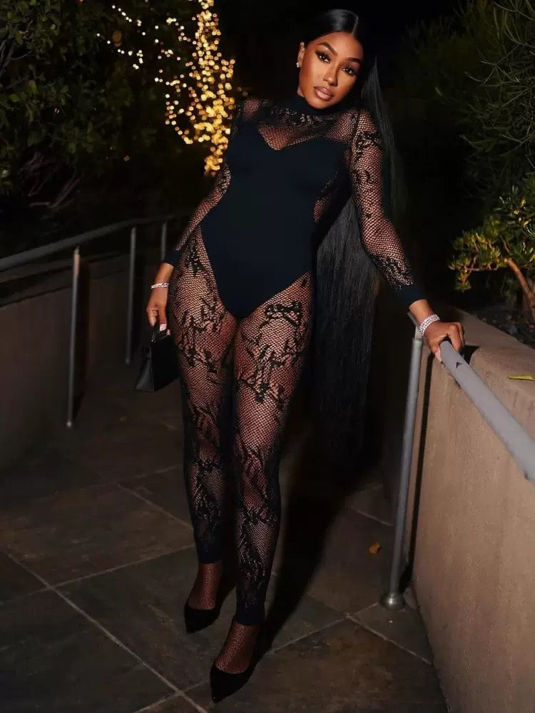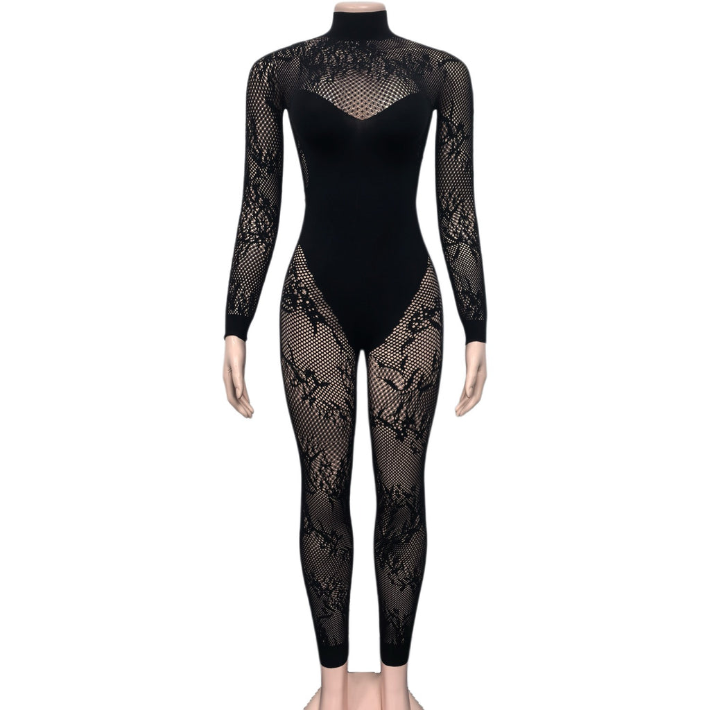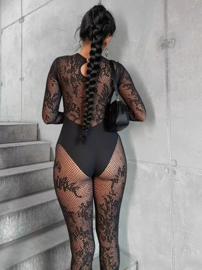 Make a dramatic entrance with this stunning high-neck jumpsuit featuring an elegant blend of mesh and lace detailing. Designed to sculpt and accentuate your figure, this piece combines a solid bodysuit-style center with sheer mesh and intricate lace panels throughout the arms, legs, and sides.