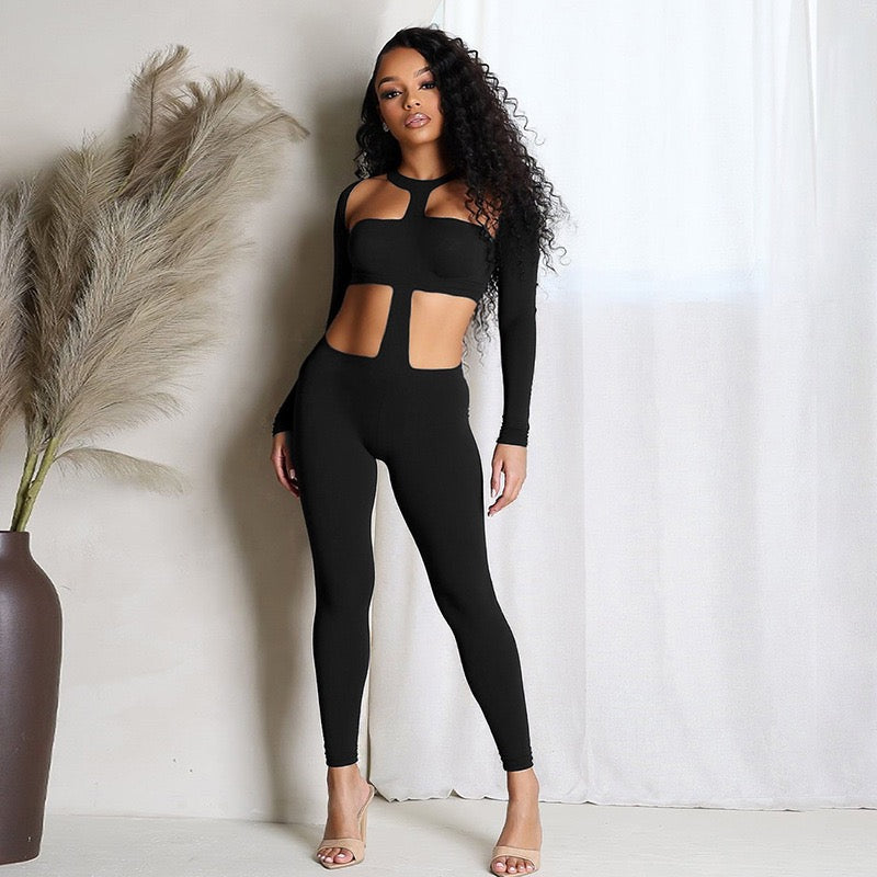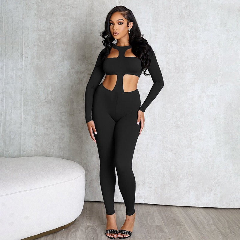 - Long sleeve jumpsuit with sheer panel and cutout design