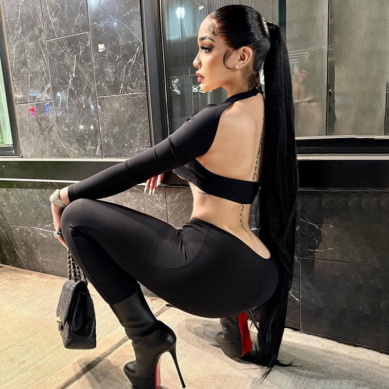 Make a bold entrance in this modern and sleek jumpsuit featuring a daring sheer panel and cutout design. Crafted from a stretchy, body-contouring fabric, this piece highlights your curves while offering comfort and flexibility. The long sleeves and high neckline balance the sultry sheer details for a sophisticated, fashion-forward look.