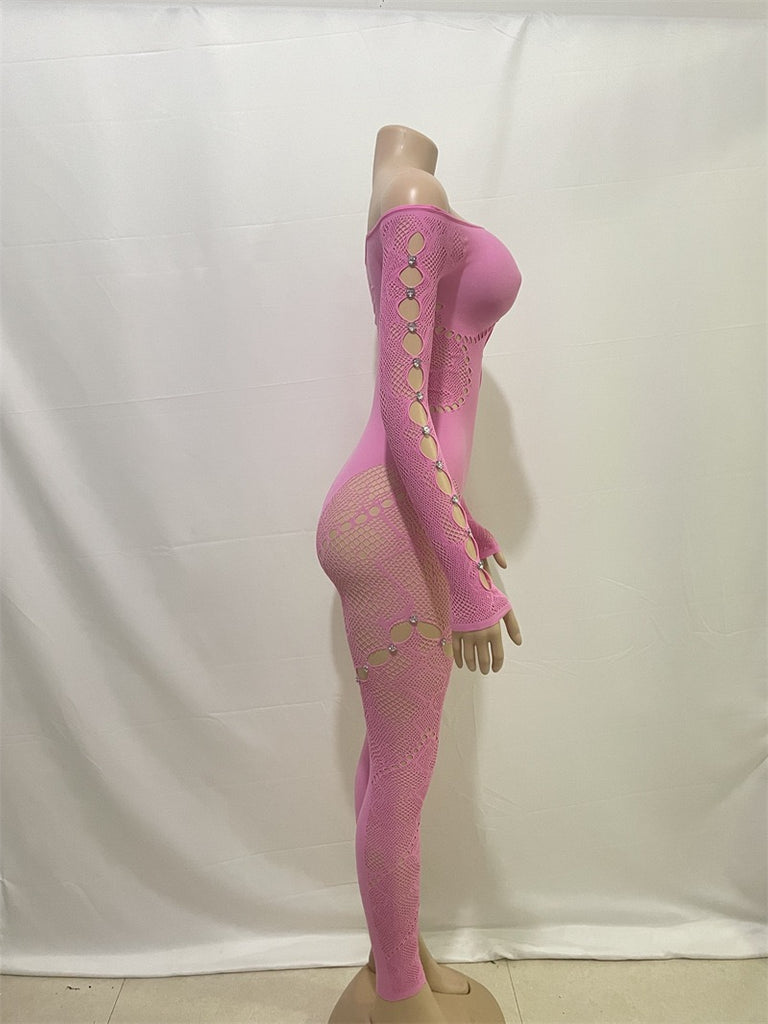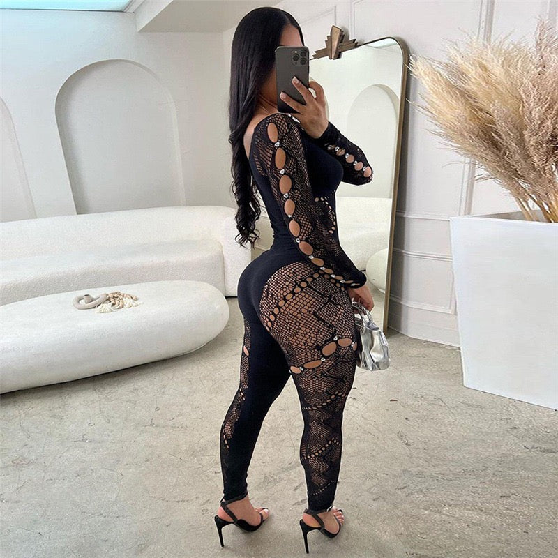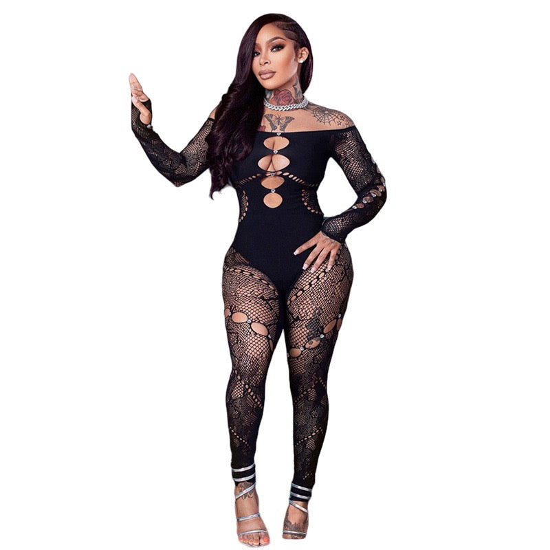 Turn up the heat in this daring off-shoulder jumpsuit that perfectly blends sultry and chic. Designed with intricate mesh panels and bold cutout detailing down the front and legs, this piece hugs your curves while highlighting your silhouette.