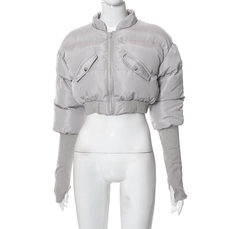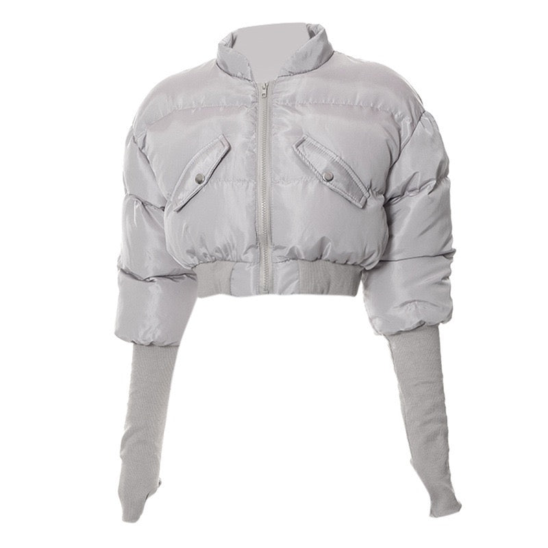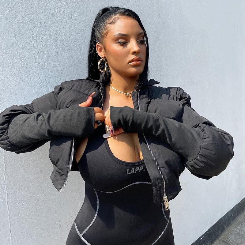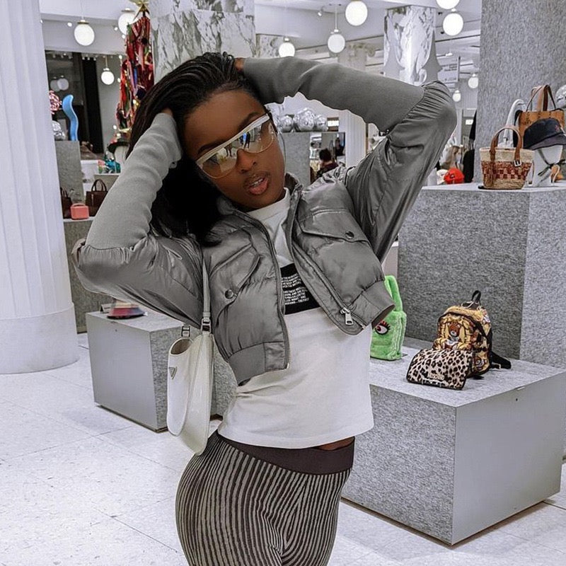 Perfect for styling with high-waisted jeans, skirts, or joggers, this statement piece elevates any casual outfit. Whether you're heading out for a night in the city or layering up for a chilly day, this cropped puffer jacket brings modern style and attitude to your wardrobe.