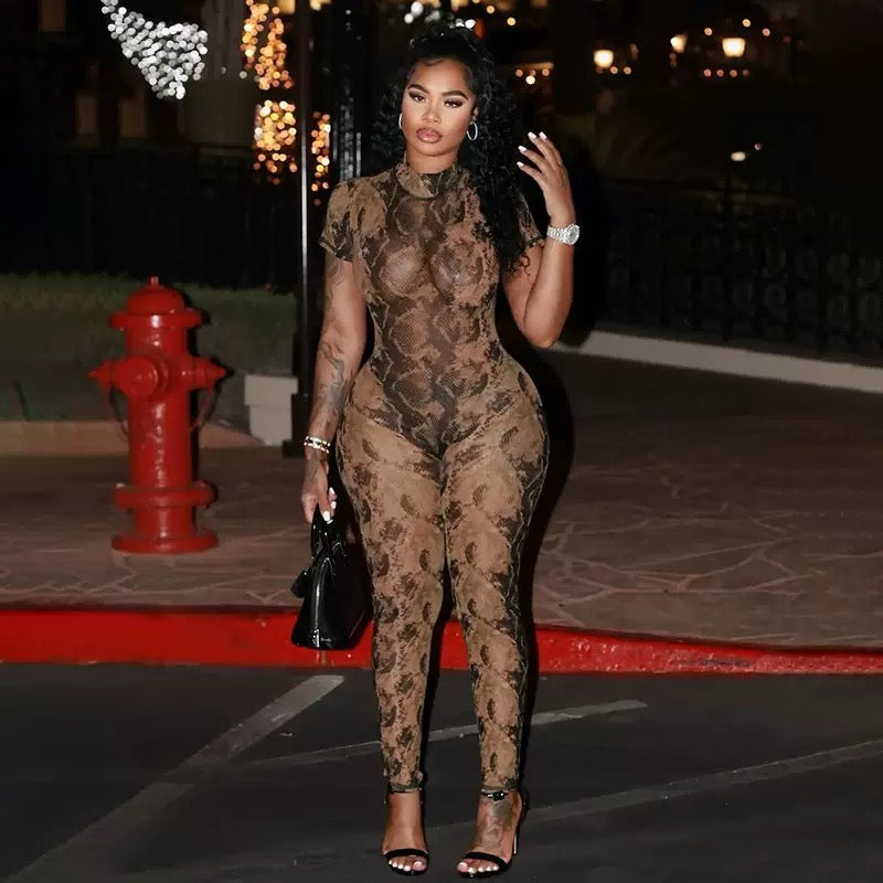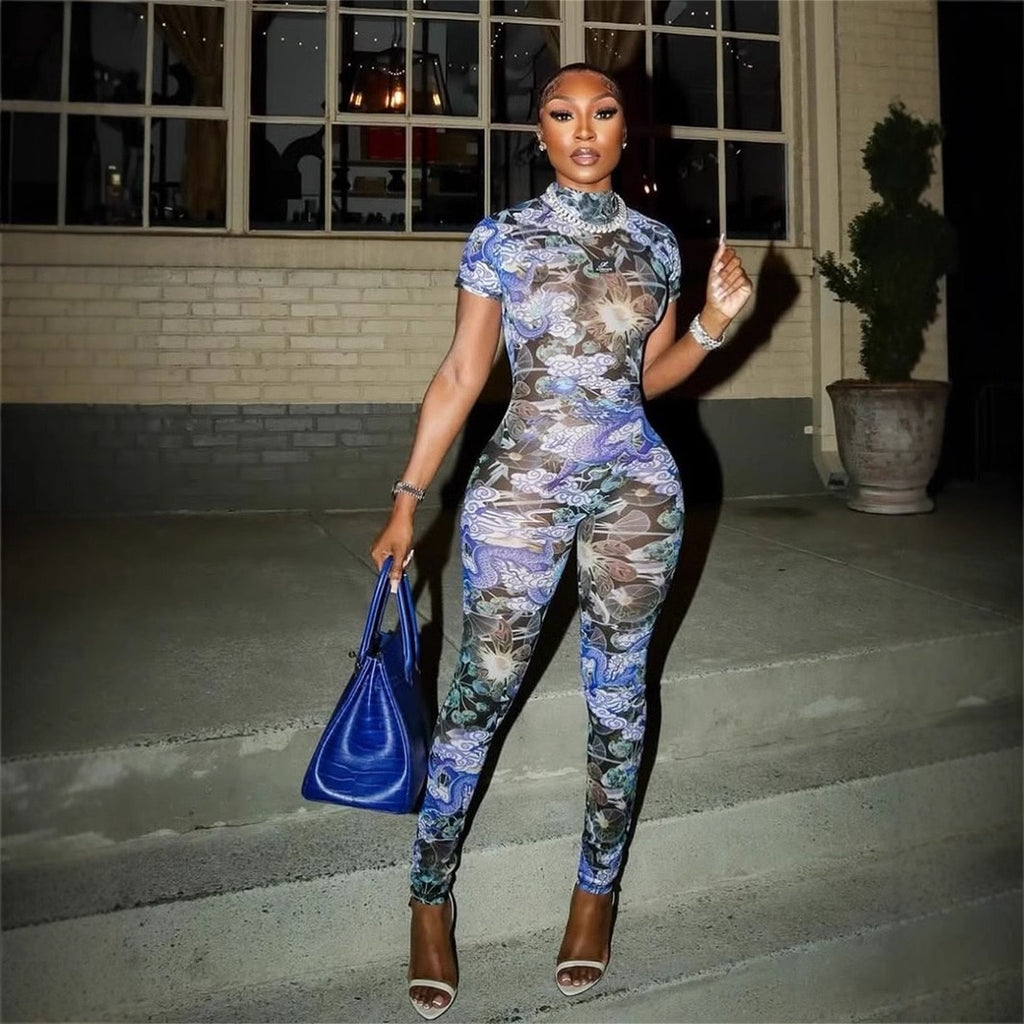 Turn heads in this bold and stylish sheer mesh jumpsuit featuring an allover artistic print design. Crafted from lightweight, stretchy mesh fabric, this jumpsuit contours beautifully to your shape while offering breathable comfort. The short sleeves and fitted silhouette create a sleek, modern look perfect for a night out or a statement daytime outfit.