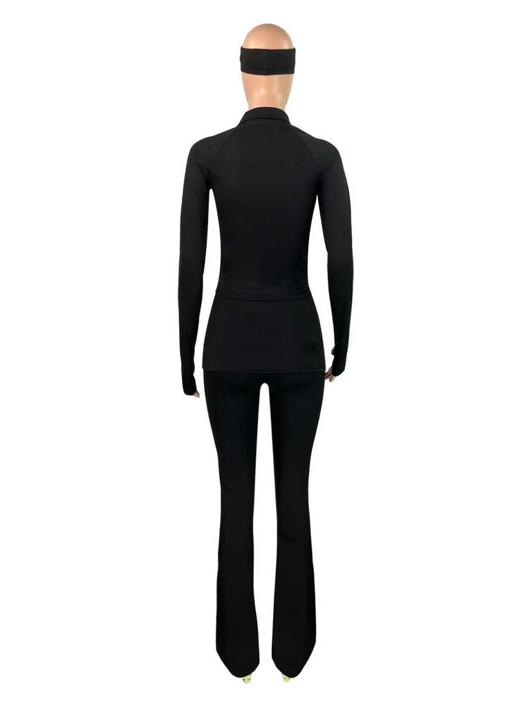 Elevate your workout look with this sleek three-piece activewear set designed for performance and style. The set includes a zip-up long sleeve jacket, high-waist flared leggings, and a matching headband for a coordinated, athletic finish.