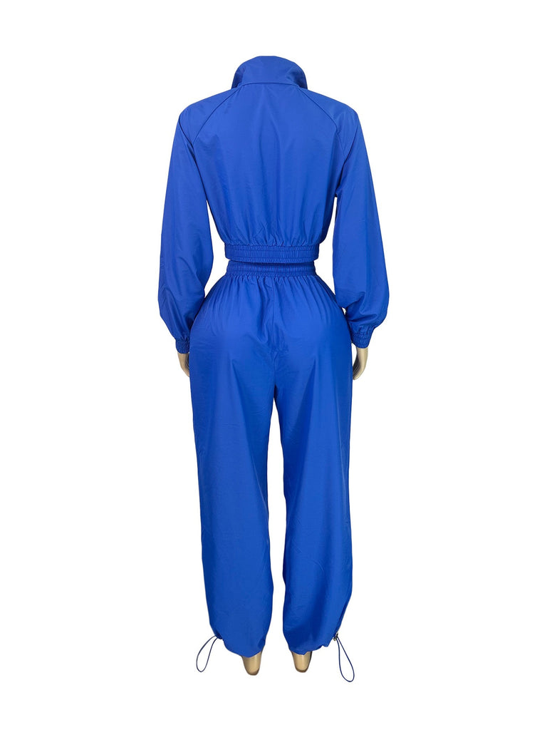 Stay stylish and ready for anything with this two-piece windbreaker set designed for comfort and edge. The set features a cropped zip-up jacket with an elastic waistband and matching drawstring jogger pants for a relaxed yet flattering fit.
