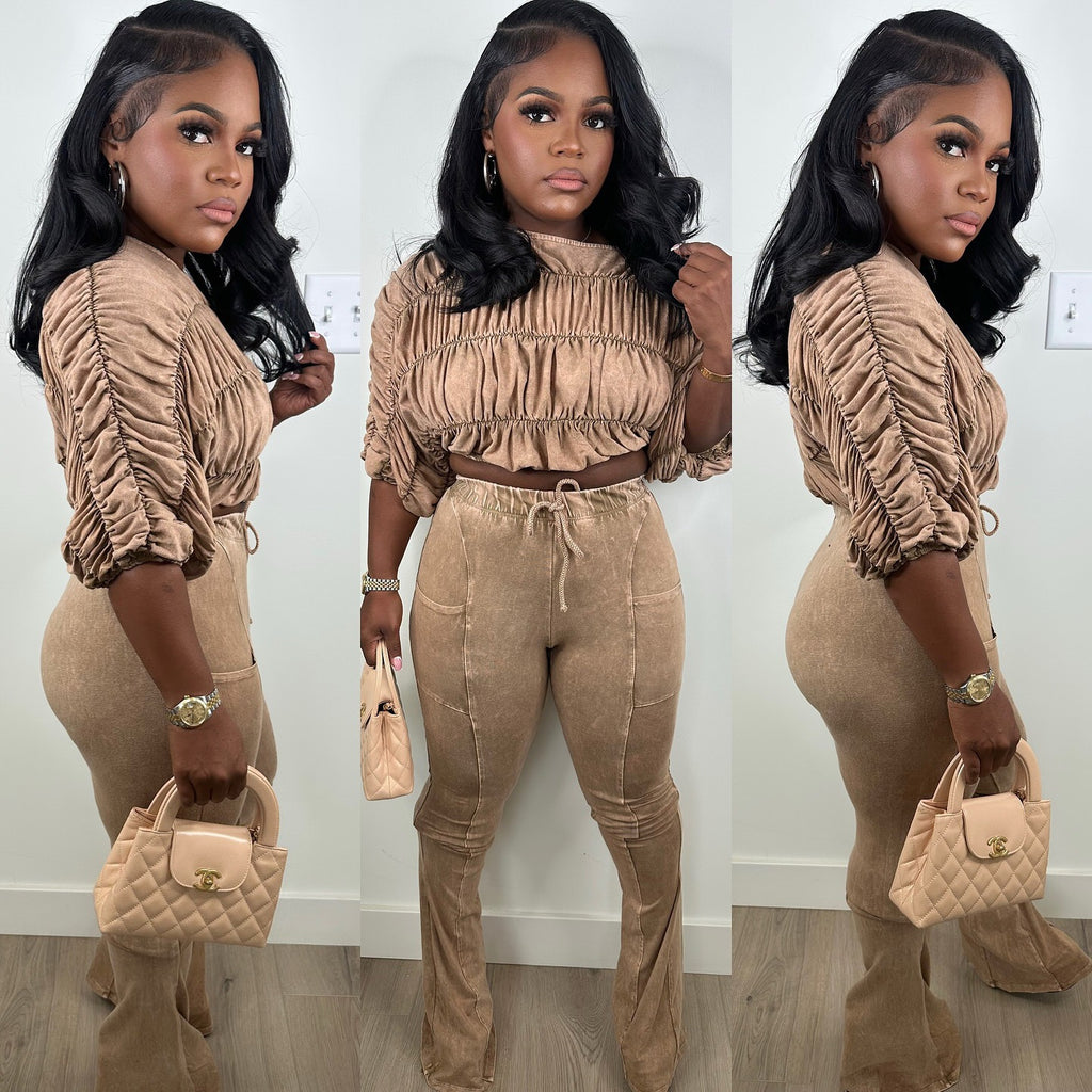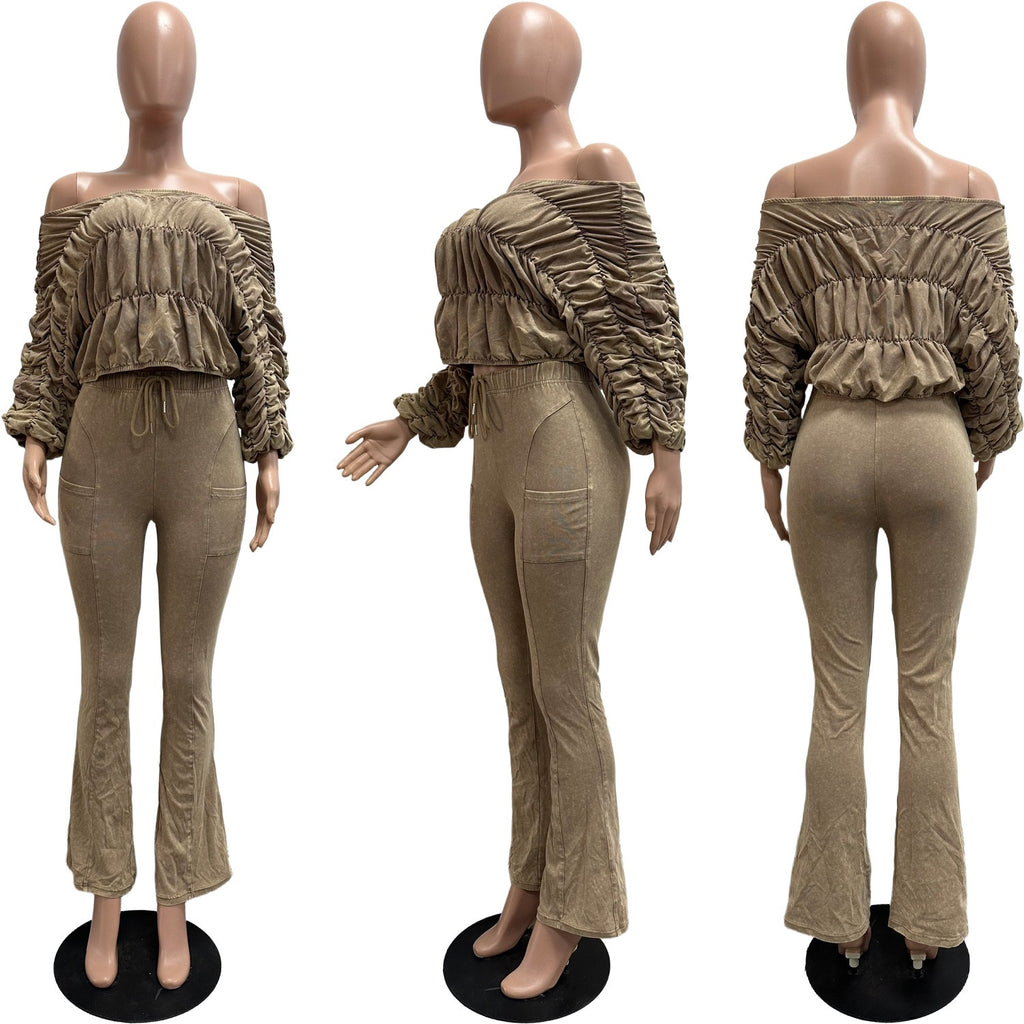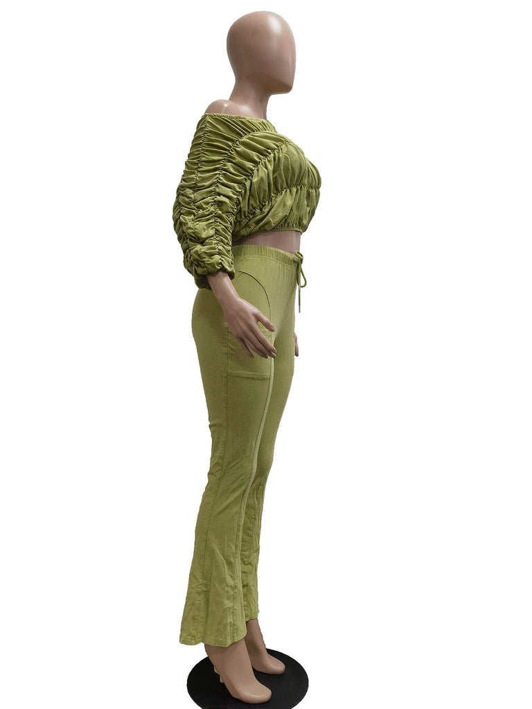 This stylish two-piece set includes a textured off-shoulder top paired with matching high-waist pants. The top features dramatic ruched detailing throughout, creating a voluminous, gathered look with a cropped silhouette that highlights the waist. It is designed with long sleeves that maintain the same ruched effect for a cohesive, eye-catching style.