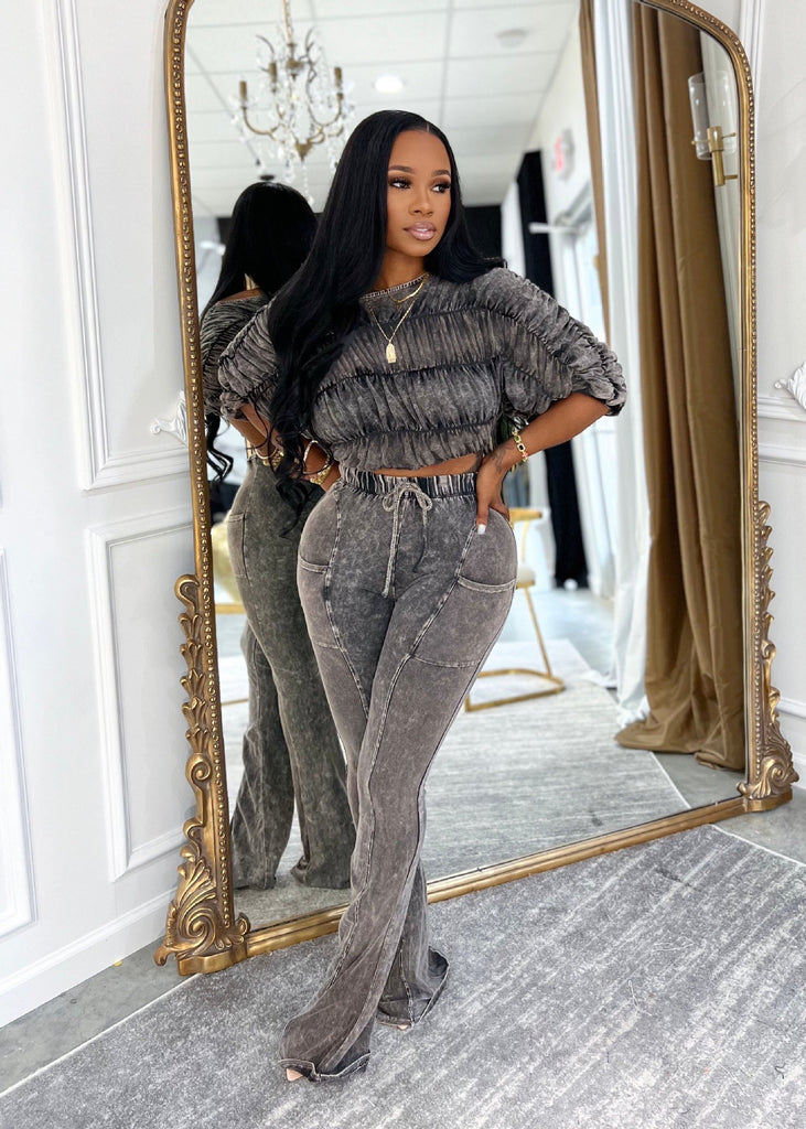 The coordinating pants offer a flattering high-rise fit with a comfortable elastic waistband and adjustable drawstring. Side patch pockets add a practical touch, while the fitted legs gently flare at the hem for a sleek, elongating finish. Perfect for casual outings, lounging, or creating a chic everyday look, this set blends comfort with elevated design.