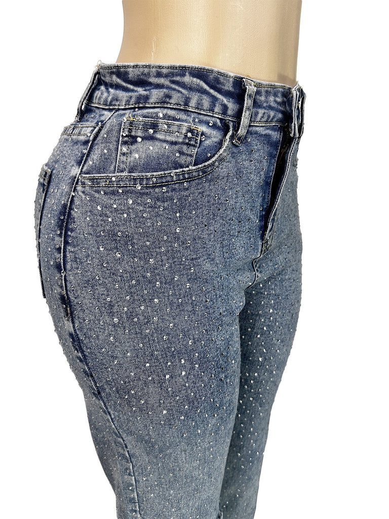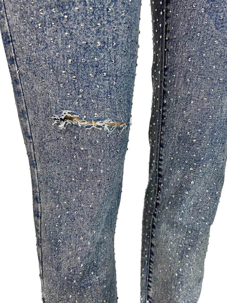 Add some sparkle to your everyday denim with these stunning high-waist jeans. Designed with a flattering skinny fit, these jeans feature allover rhinestone embellishments that catch the light from every angle, giving your outfit a glamorous touch.