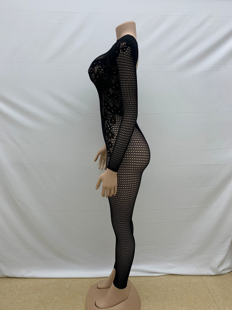 Make a bold statement with this stunning lace and mesh jumpsuit designed to showcase your confidence and curves. Featuring an intricate lace pattern overlay with sheer fishnet detailing, this piece combines elegance and allure for an unforgettable look.