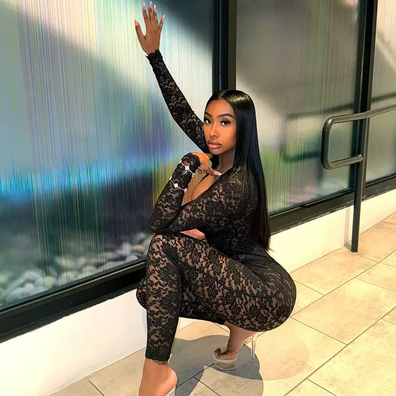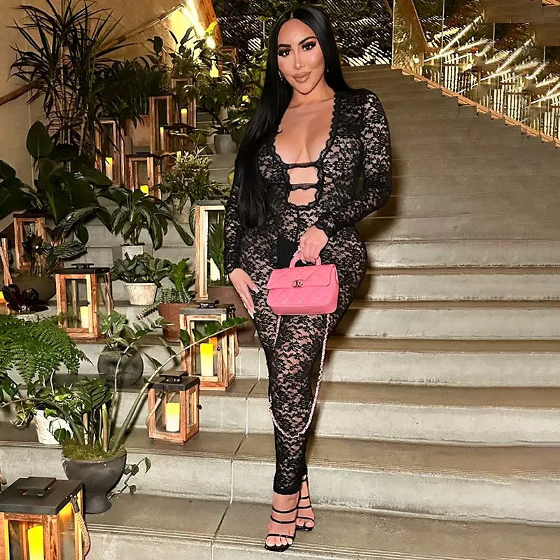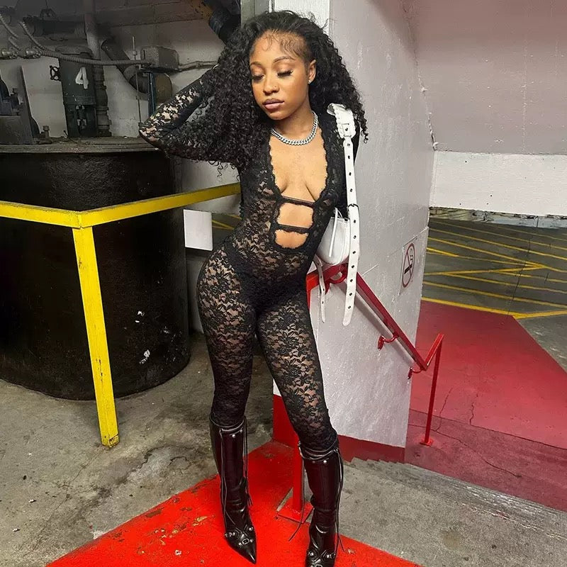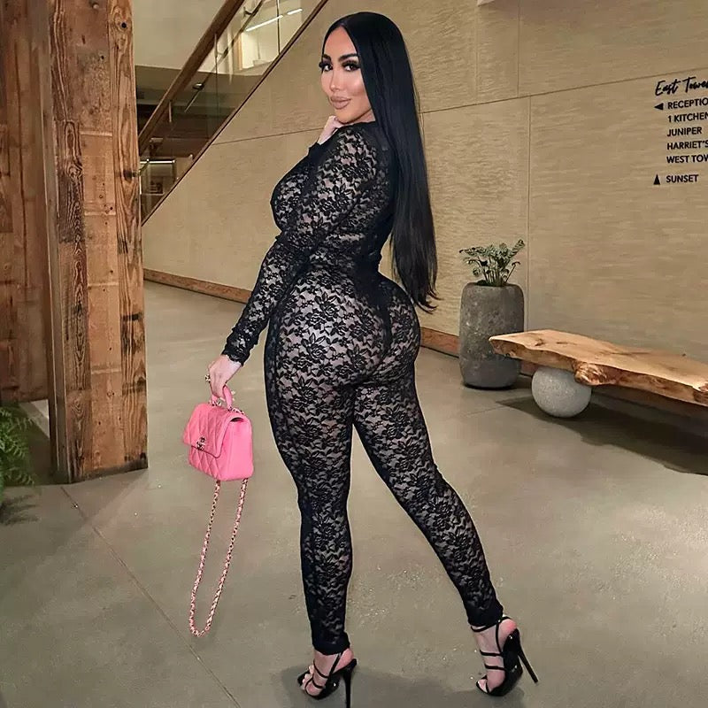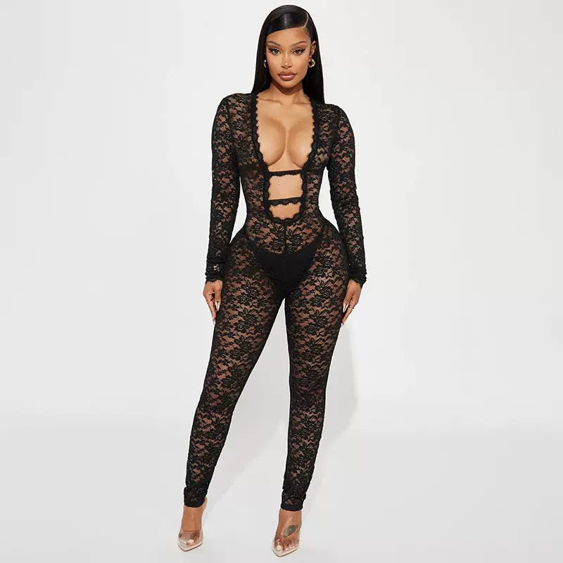 Unleash your bold side with this sheer floral lace jumpsuit, designed to make a striking impression. Featuring a delicate all-over lace construction, it offers a sultry, body-hugging fit that highlights your silhouette. The plunging neckline and cut-out front detail add a daring edge, while the long sleeves and full-length legs balance the look with an elegant finish.