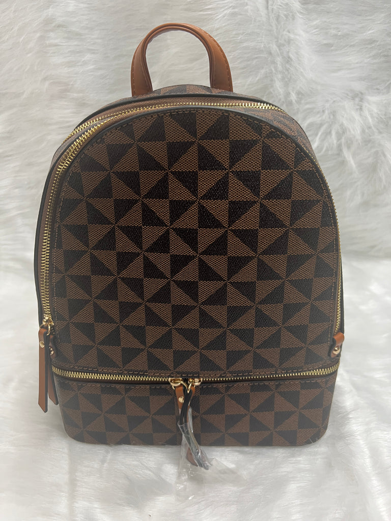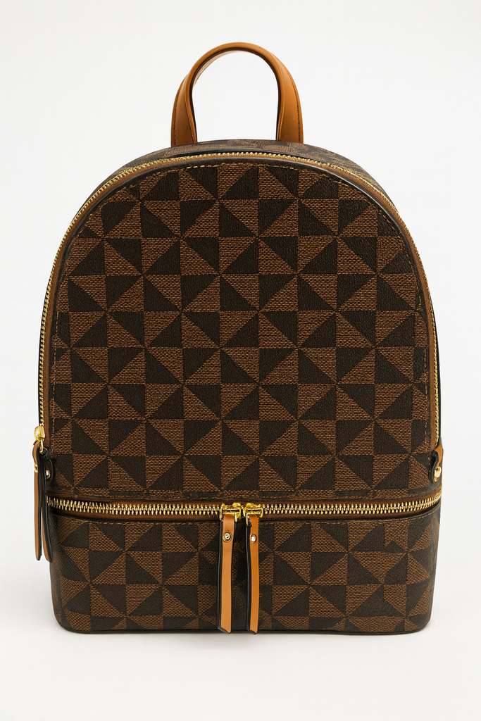 This modern backpack showcases a bold geometric patterned design, blending functionality with standout style. Crafted with a structured silhouette, it features dual zipper compartments for easy organization, making it a perfect companion for everyday use.